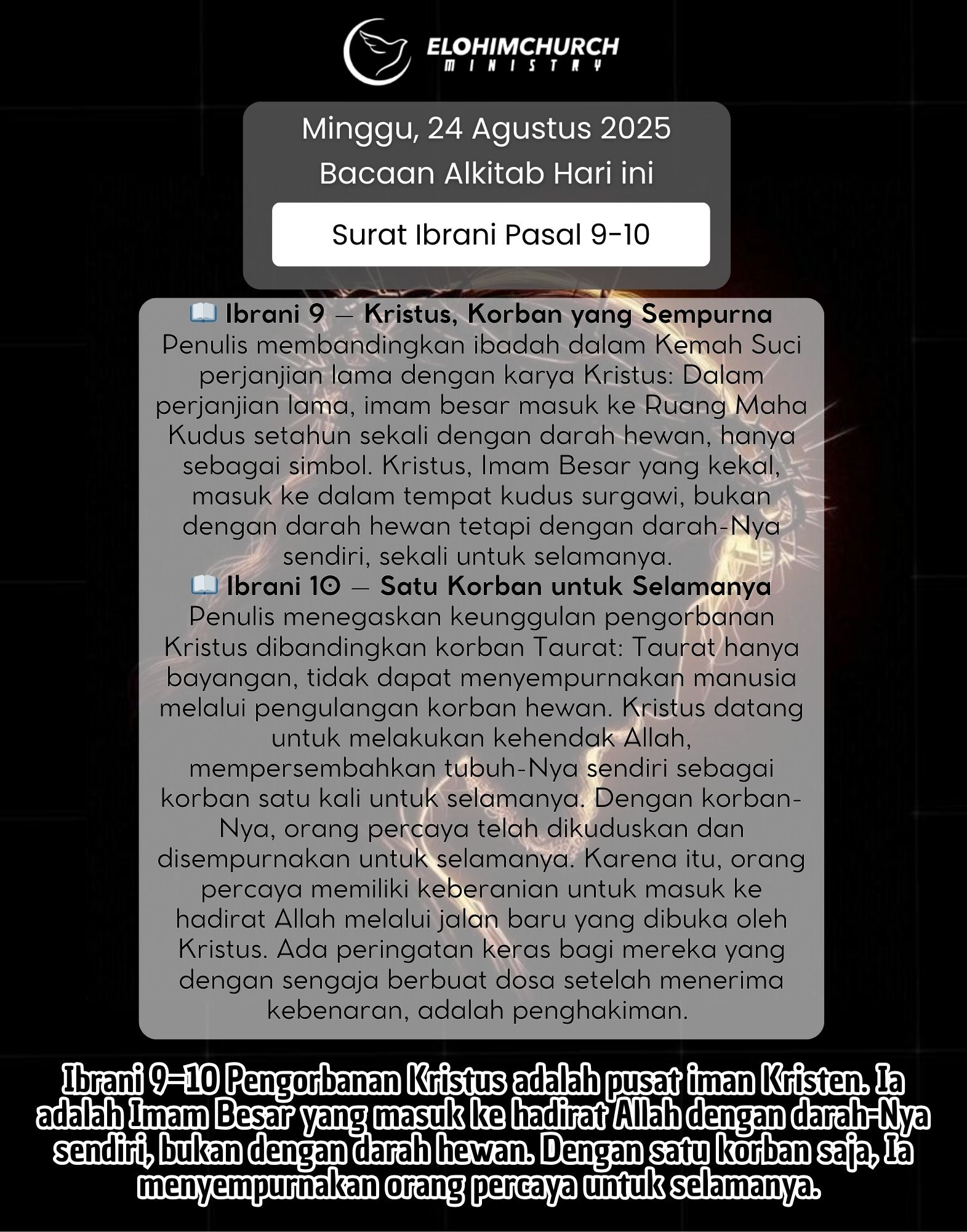 📖 Ibrani 9 – Kristus, Korban yang Sempurna Penulis membandingkan ibadah dalam Kemah Suci perjanjian lama dengan karya Kristus: Dalam ...