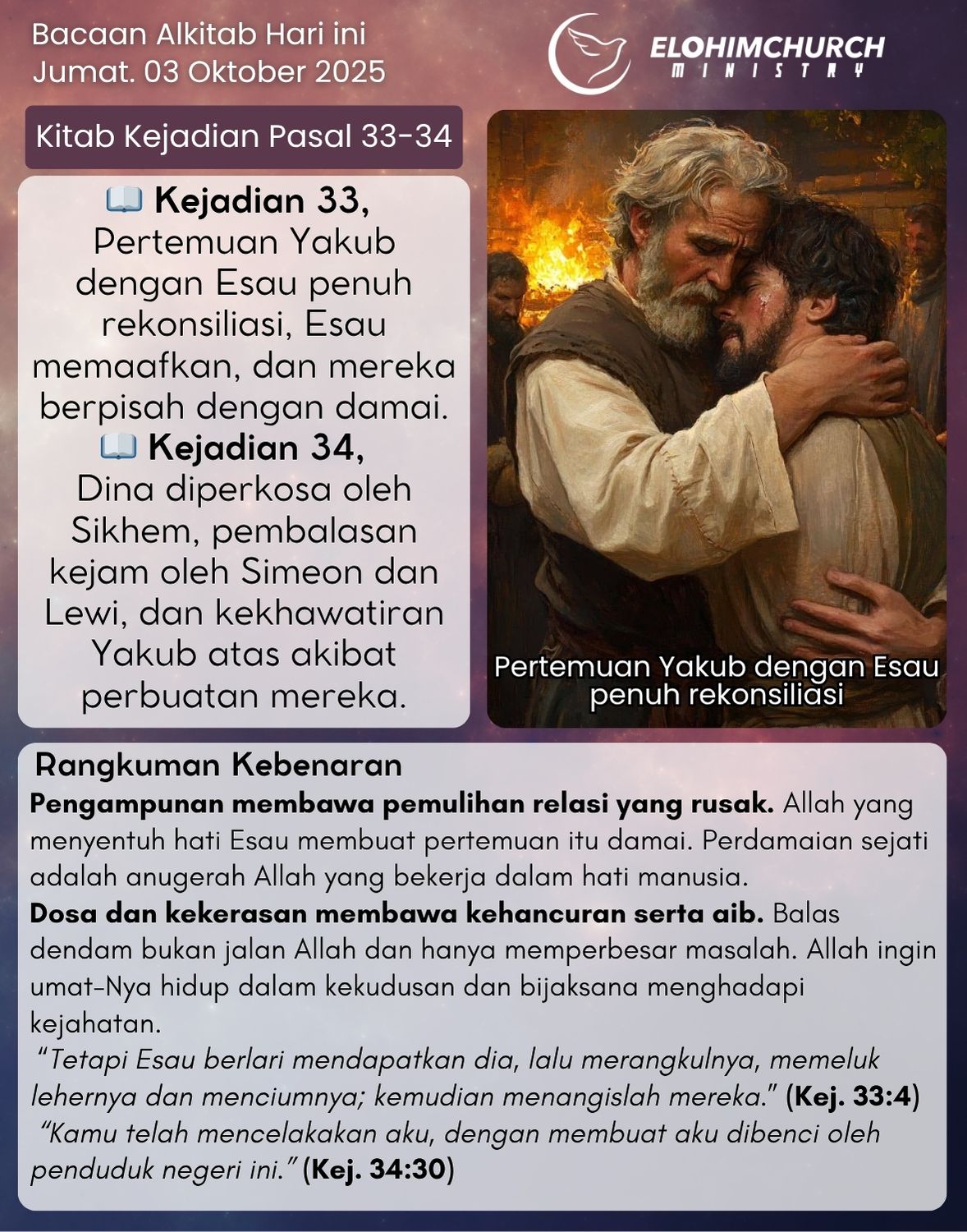 Bacaan Alkitab Jumat, 03 Oktober 2025 ~ Kitab Kejadian Pasal 33-34