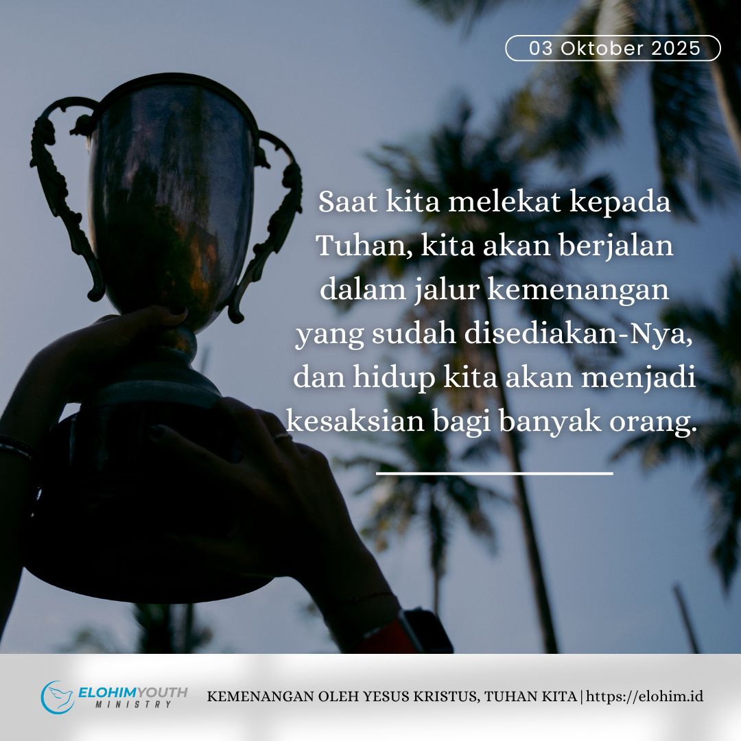 Renungan Harian Youth, Jumat 03 Oktober 2025 Syalom rekan-rekan Elohim Youth! π Apa kabarnya hari ini? Semoga kita semua tetap dalam sukacita Tuhan. Hari ini kita akan belajar bagaimana menjalani kehidupan yang berkemenangan di dalam Yesus Kristus. Firman Tuhan dalam 1 Korintus 15:57 berkata: β… Tetapi syukur kepada Allah, yang telah memberikan kepada kita kemenangan …