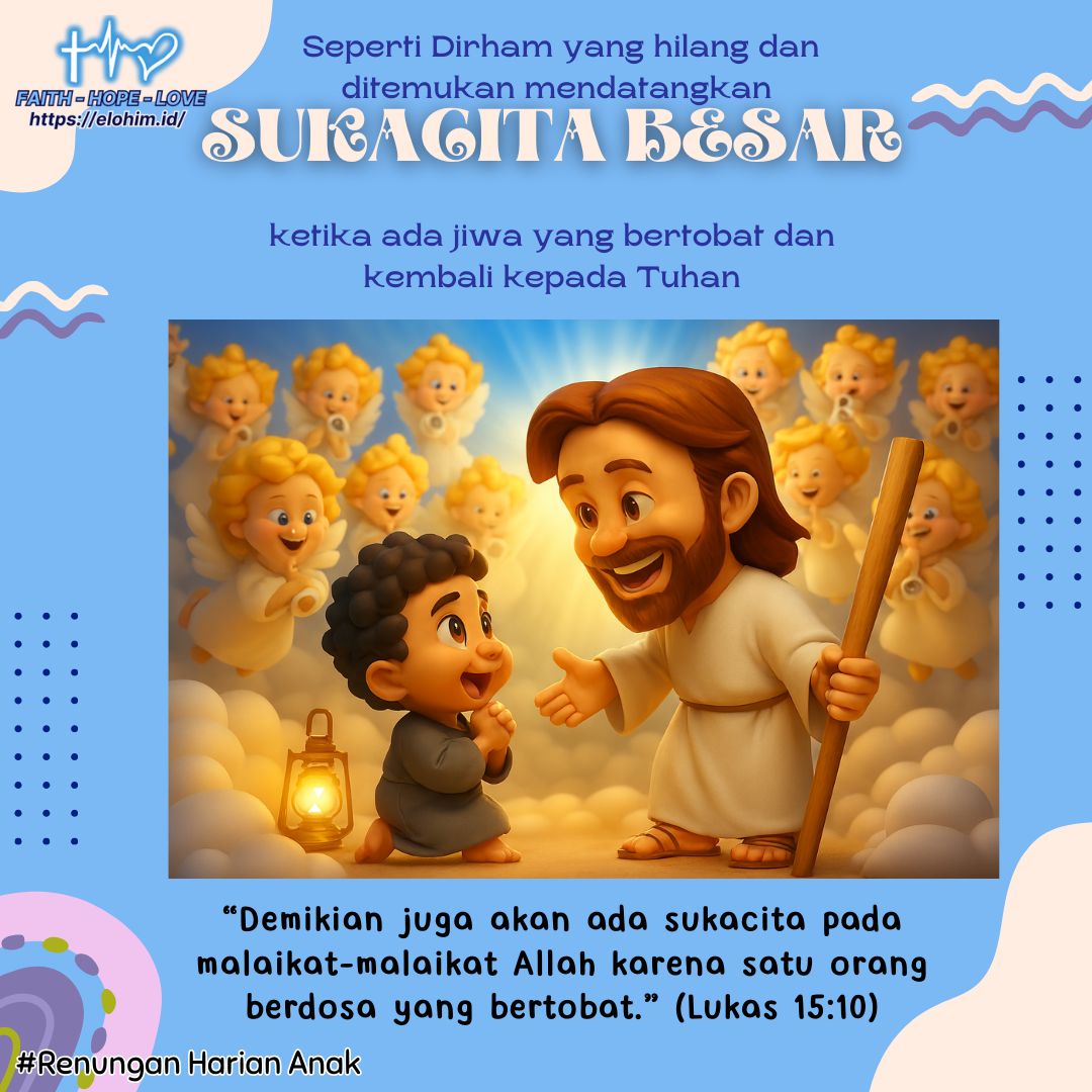 Renungan harian Anak, Jumat 03 Oktober 2025 Syalom, adik-adik yang manis! β¨ Apa kabar kalian hari ini? Semoga selalu sehat, bersukacita, dan siap belajar firman Tuhan ya! Hari ini kita akan belajar tentang betapa berharganya setiap jiwa di mata Tuhan, lewat perumpamaan tentang dirham yang hilang. Adik-adik, pernahkah kalian kehilangan sesuatu yang sangat berharga? Misalnya, …