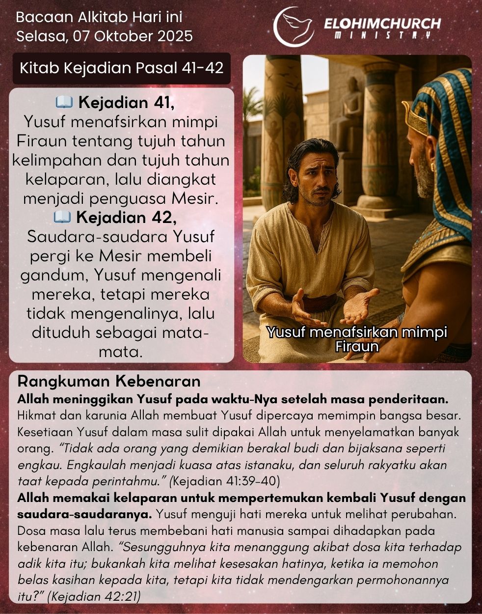 Renungan Harian Rabu, 08 Oktober 2025 Ayat Pokok: Yesaya 25:1 (TB) “Ya TUHAN, Engkaulah […]Bacaan Alkitab Selasa, 07 Oktober 2025 ~ Kitab Kejadian Pasal 41-42