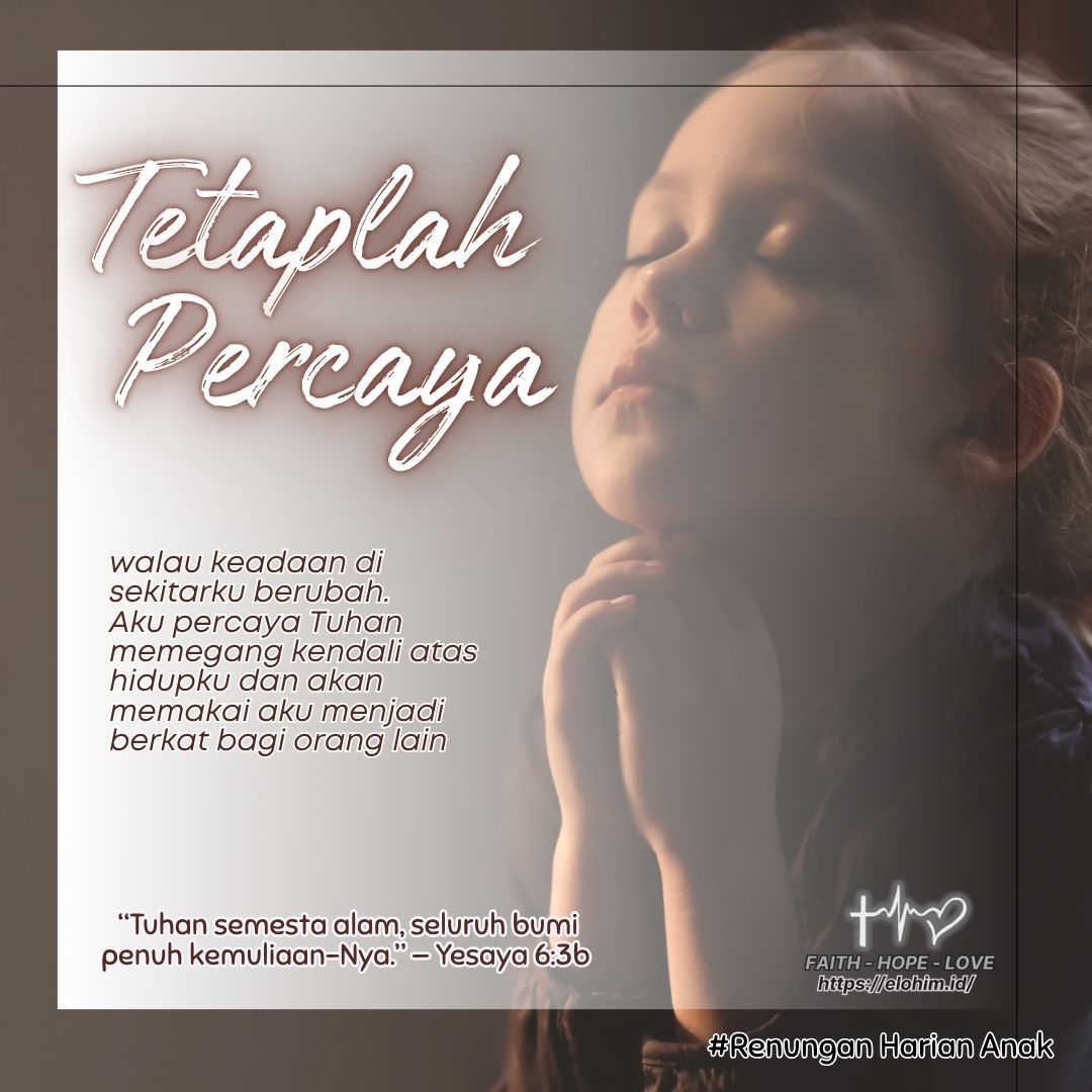 Renungan Harian Anak, Senin 13 Oktober 2025 Shalom, adik-adik Elohim Kids! ✨ Apa kabar hari ini? Kakak harap semuanya sehat, ceria, dan siap belajar firman Tuhan ya! 😊 Hari ini kita akan belajar tentang “TETAPLAH PERCAYA” — bahwa walaupun keadaan berubah, Tuhan tidak pernah berubah. Ia selalu berkuasa dan memegang kendali atas hidup kita. 🙌 …