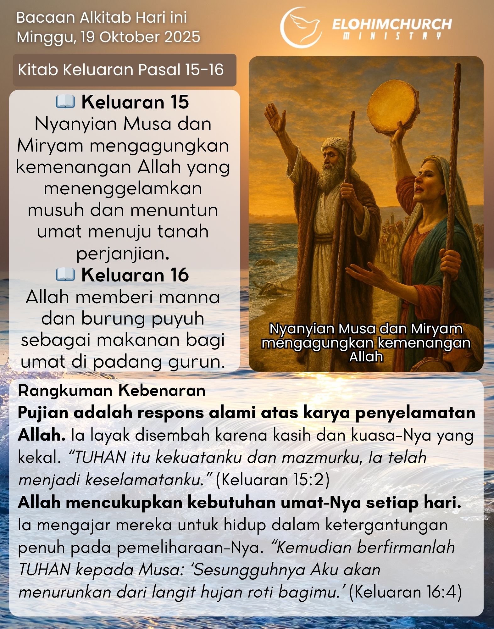 π Keluaran 15, Nyanyian Musa dan Miryam mengagungkan kemenangan Allah yang menenggelamkan musuh dan menuntun umat menuju tanah perjanjian. π ...