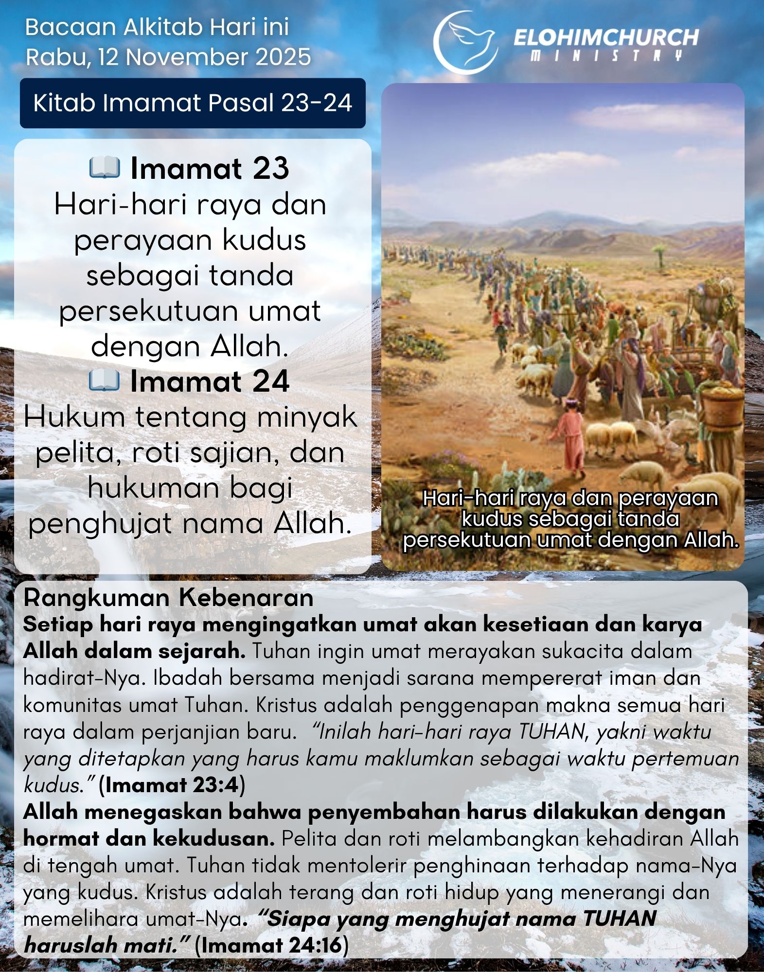 📖 Imamat 23, Hari-hari raya dan perayaan kudus sebagai tanda persekutuan umat dengan Allah. 📖 Imamat 24, Hukum tentang minyak ...