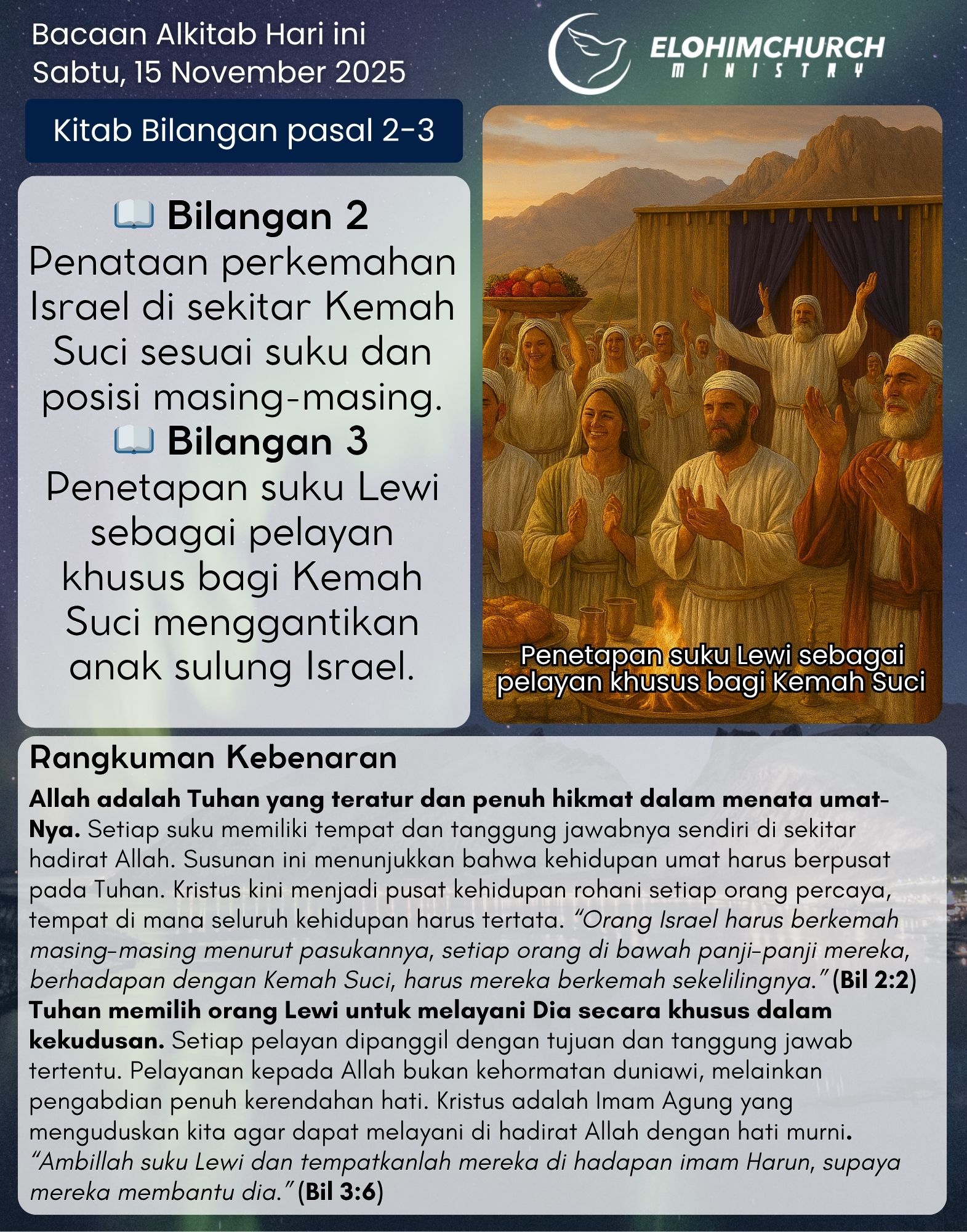 📖 Bilangan 2, Penataan perkemahan Israel di sekitar Kemah Suci sesuai suku dan posisi masing-masing. 📖 Bilangan 3, Penetapan suku ...