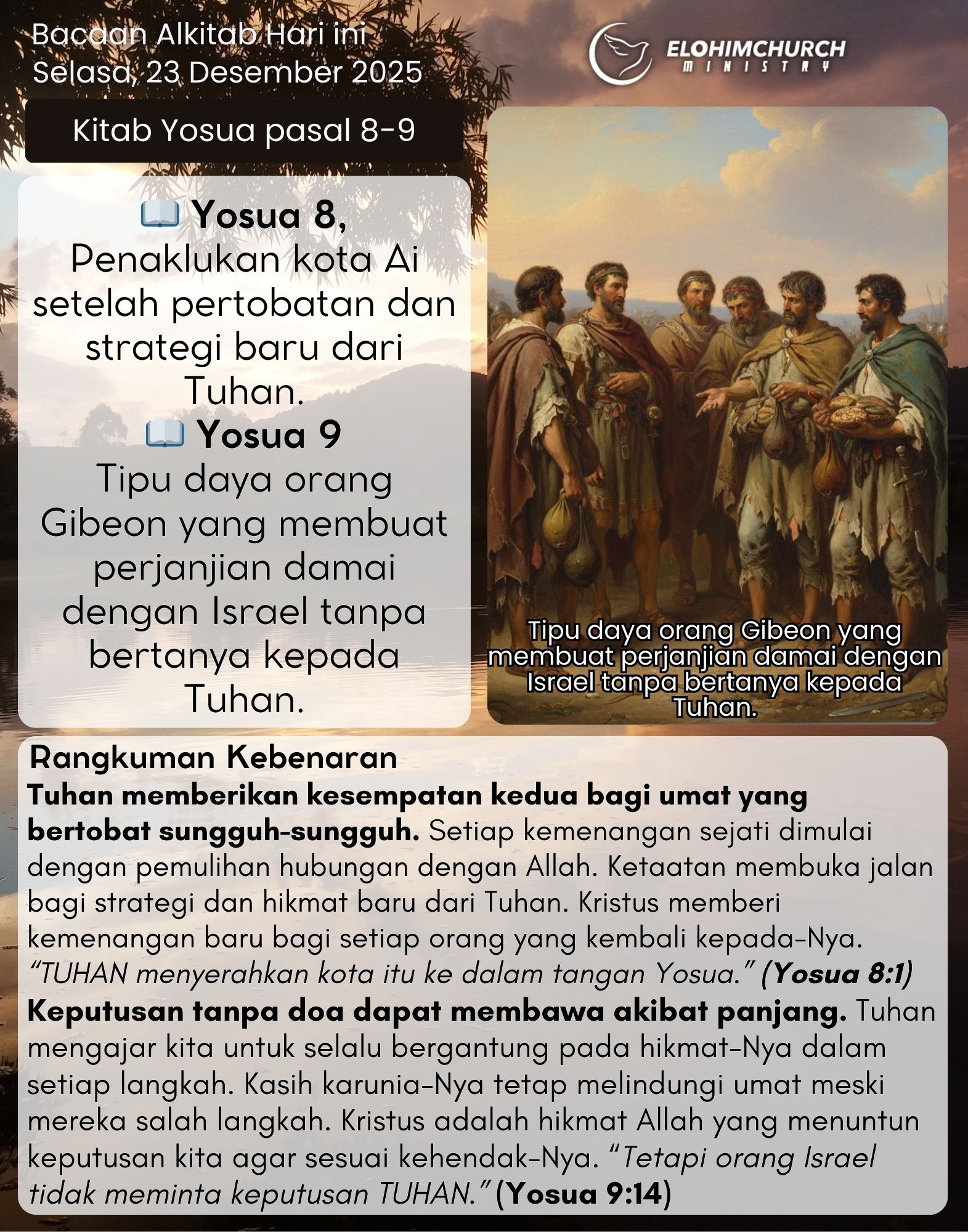 π Yosua 8, Penaklukan kota Ai setelah pertobatan dan strategi baru dari Tuhan. π Yosua 9, Tipu daya orang Gibeon ...