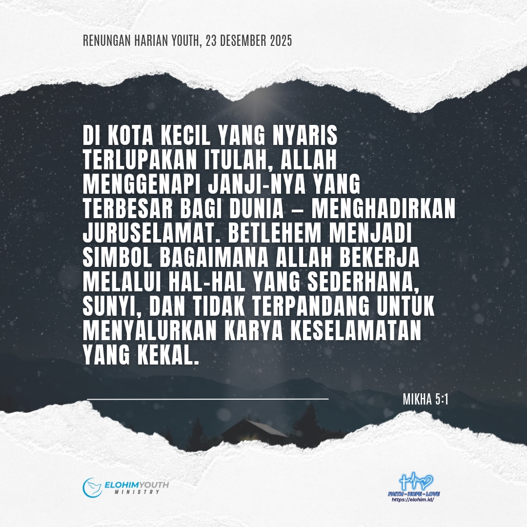 Renungan Harian Youth, Selasa 23 Desember 2025 Mikha 5:1,Tetapi engkau, hai Betlehem Efrata, hai yang terkecil di antara kaum-kaum Yehuda, ...