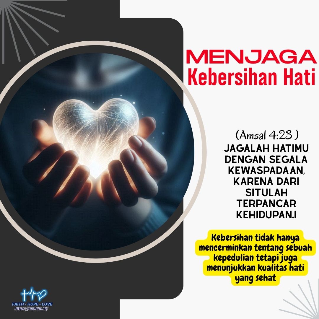 Hati adalah Sumber Kehidupan seperti mata air, Renungan kita pagi ini mengingatkan untuk menjaga kebersihan hati, bahwa hati adalah sumber kehidupan yang akan menentukan perkataan dan tindakan seseorang. Untuk membersihkan hati, seseorang perlu menjaga ketulusan, menjauhi sifat iri dan dengki. Selain itu, menjaga hati juga dapat dilakukan dengan mengisi hari dengan kebaikan, bergaul dengan orang-orang saleh, dan beribadah dengan khusyuk. Ada slogan “ berasal dari sumber yang murni” sesuatu yg baik. Hati yang kotor akan menghasilkan perkataan dan tindakan yang kotor pula, sedangkan hati yang bersih akan memancarkan kebaikan.