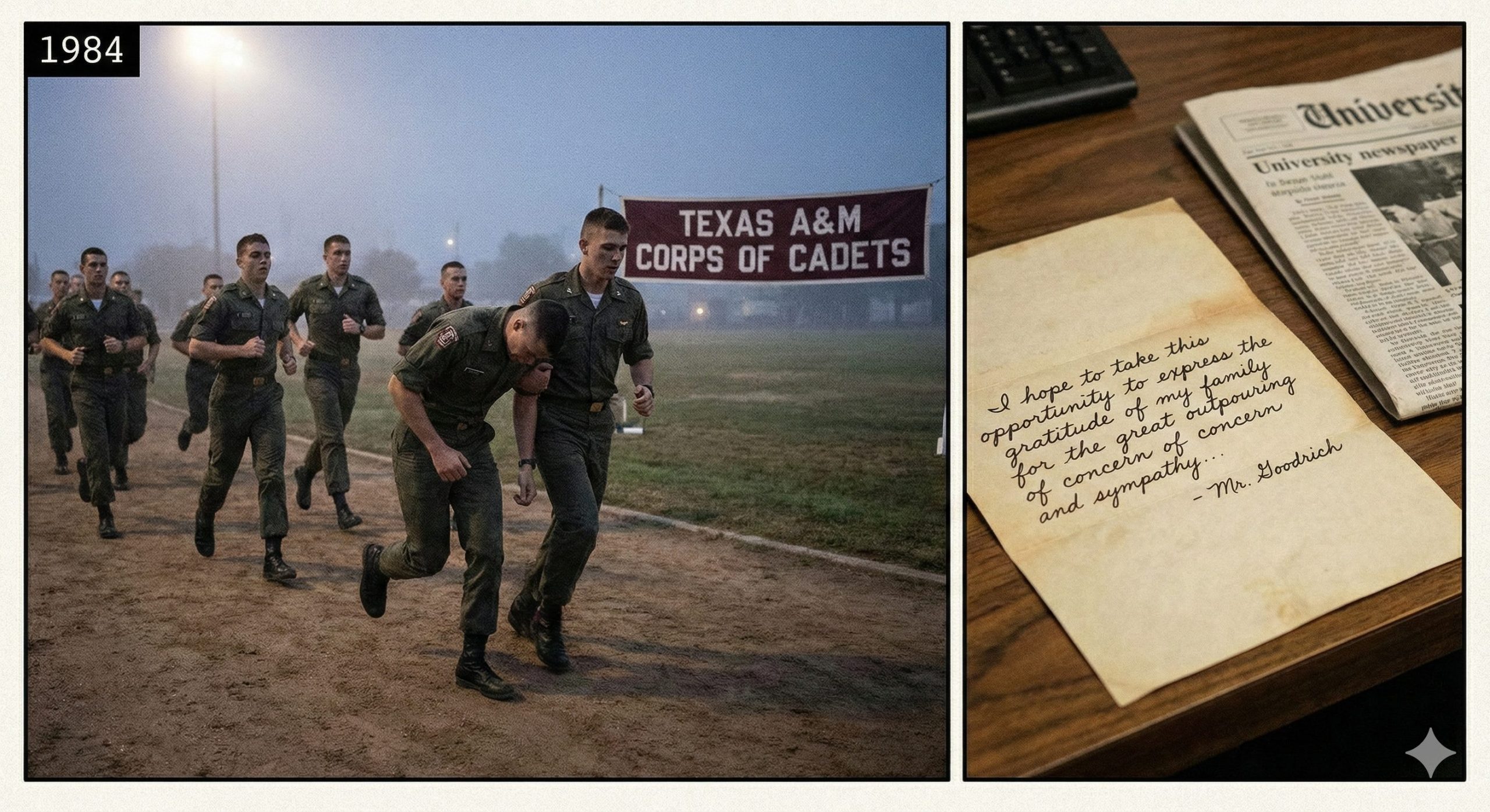 Beberapa hari setelah tiba di kampus Texas A&M University pada tahun 1984, Bruce Goodrich dibangunkan pada pukul dua dini hari. Kakak- kakak kelas membangunkannya dari tempat tidur untuk memelonconya melalui program Barisan Kadet, sebuah program orientasi bergaya militer. Bruce dipaksa untuk berolah raga dan berlari beberapa kilometer dalam cuaca yang panas dan lembab. Ketika akhirnya ia tidak kuat lagi dan terjatuh, ia dipaksa bangkit untuk meneruskan larinya. Namun ia terjatuh lagi, mengalami koma, dan meninggal pada hari itu juga. Para siswa yang memaksa Bruce melakukan latihan itu telah diajukan ke pengadilan karena dituduh mengakibatkan kematiannya.