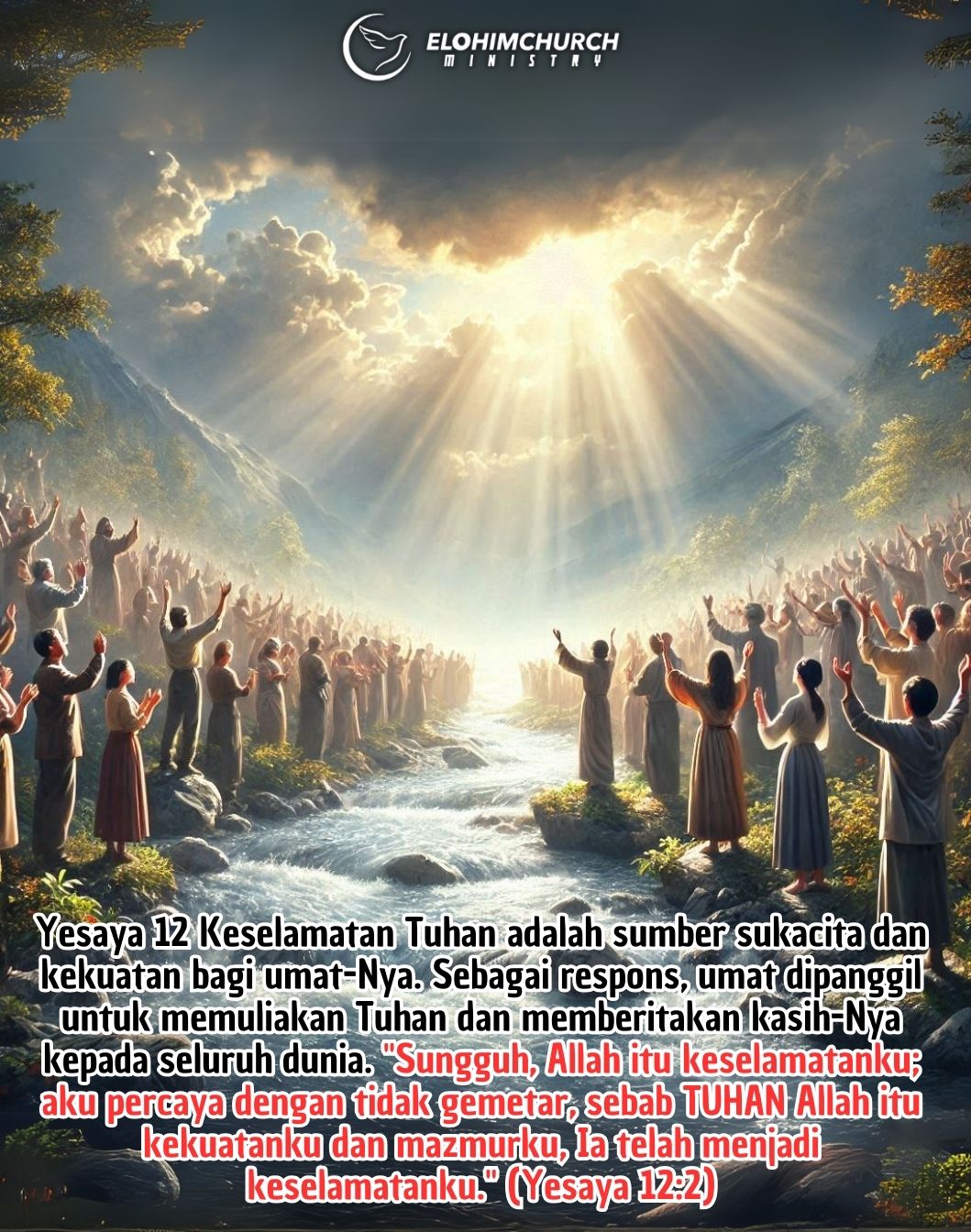 Dalam pasal ke-12 dari Kitab Yesaya, nabi mengungkapkan kegembiraan dan syukur umat Allah karena kasih dan penyertaan-Nya. Mereka menyadari bahwa meskipun Allah pernah murka kepada mereka, murka-Nya telah reda dan Ia memberikan penghiburan. Umat Allah menyatakan keyakinan mereka bahwa Allah adalah keselamatan mereka, dan mereka tidak takut karena Ia adalah kekuatan dan puji-pujian mereka. Mereka mengundang semua orang untuk bersyukur kepada TUHAN, memuji dan memberitakan perbuatan-Nya di antara bangsa-bangsa, dan menyatakan bahwa nama-Nya ditinggikan. Umat Allah bersorak-sorai dan bernyanyi bagi TUHAN karena Ia telah melakukan hal-hal yang sangat baik, dan mereka mengakui bahwa Yang Kudus dari Israel tinggal di tengah-tengah mereka.