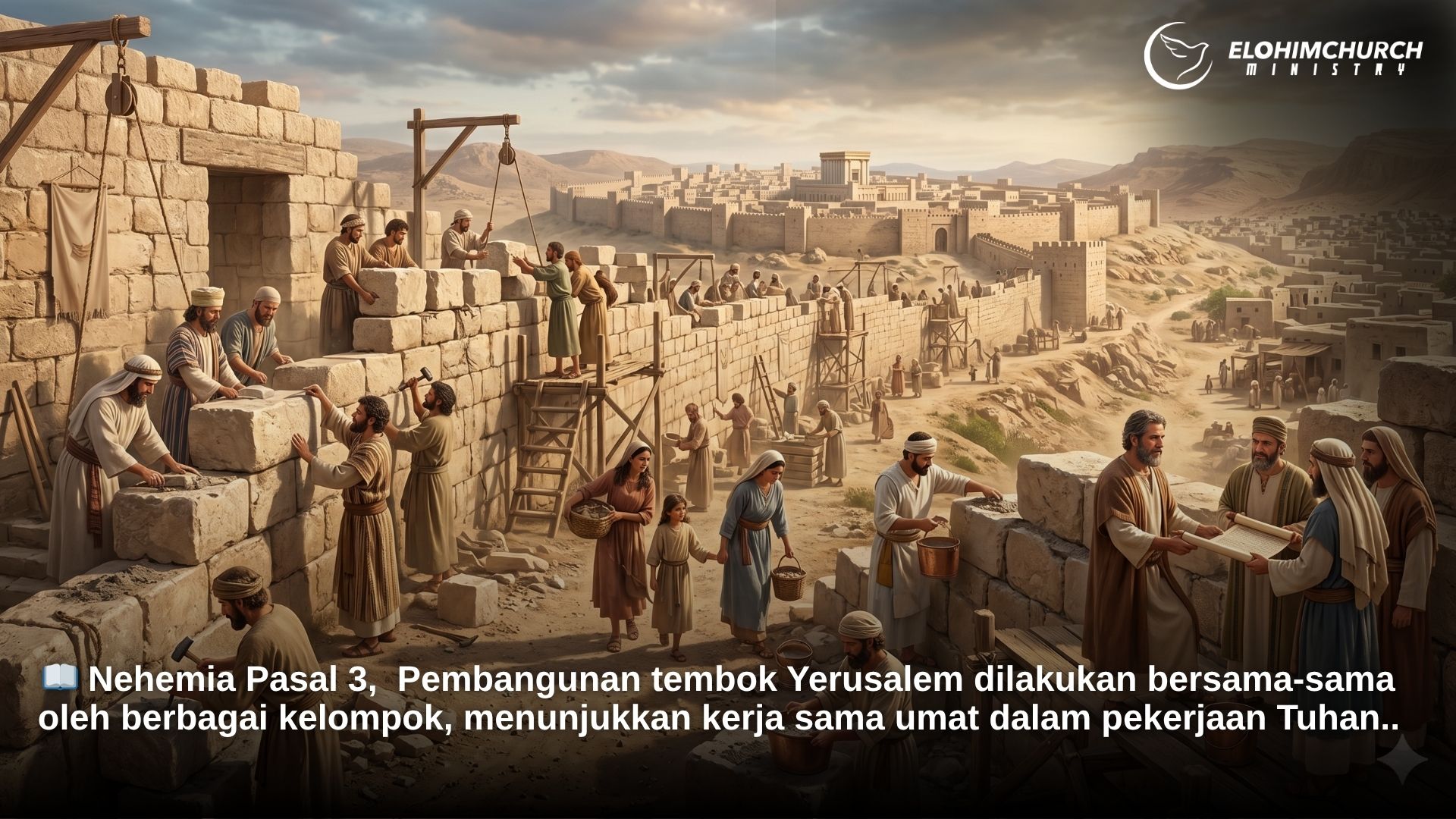 📖 Nehemia Pasal 3, Pembangunan tembok Yerusalem dilakukan bersama-sama oleh berbagai kelompok, menunjukkan kerja sama umat dalam pekerjaan Tuhan..