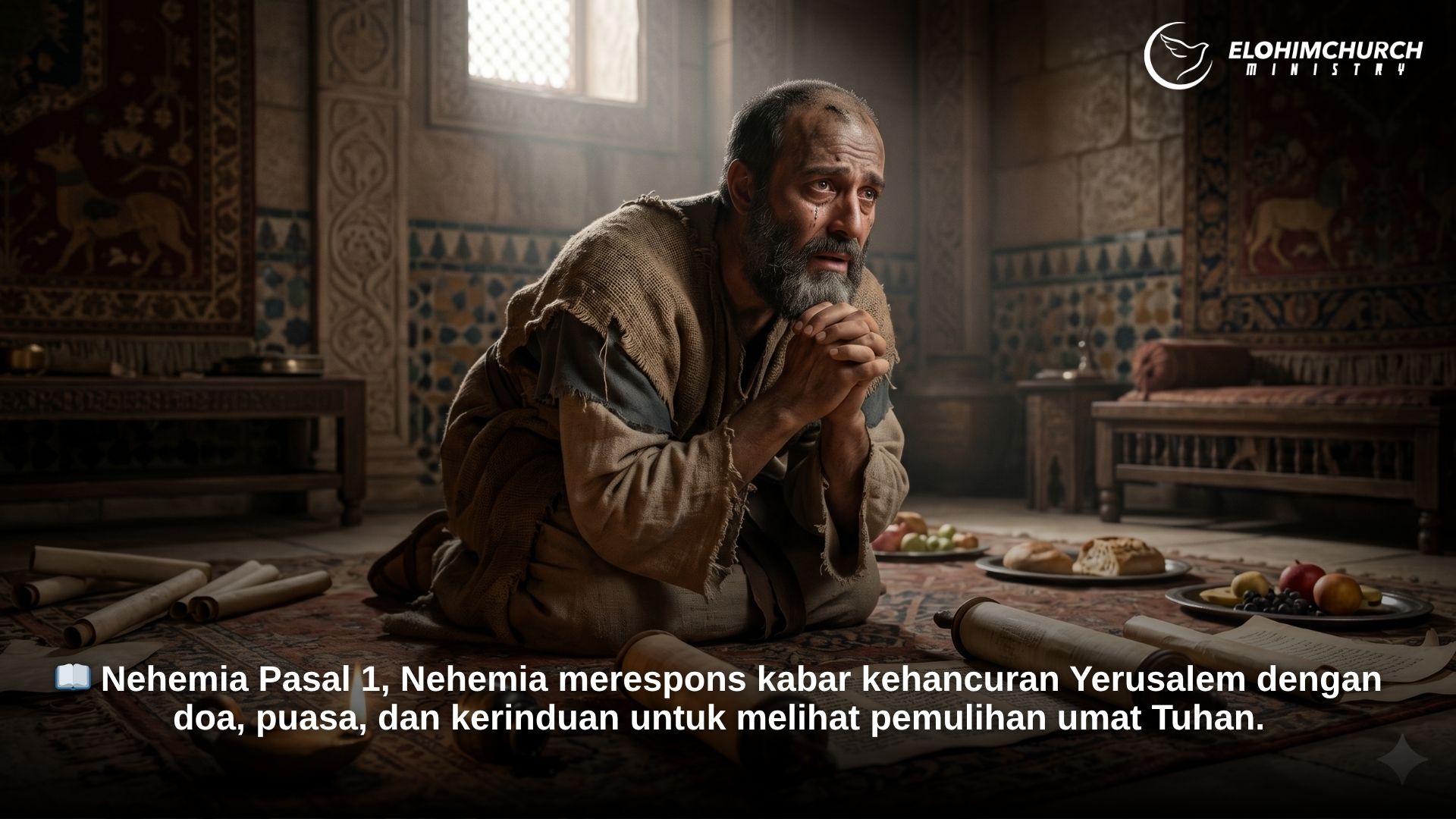 📖 Nehemia Pasal 1, Nehemia merespons kabar kehancuran Yerusalem dengan doa, puasa, dan kerinduan untuk melihat pemulihan umat Tuhan.