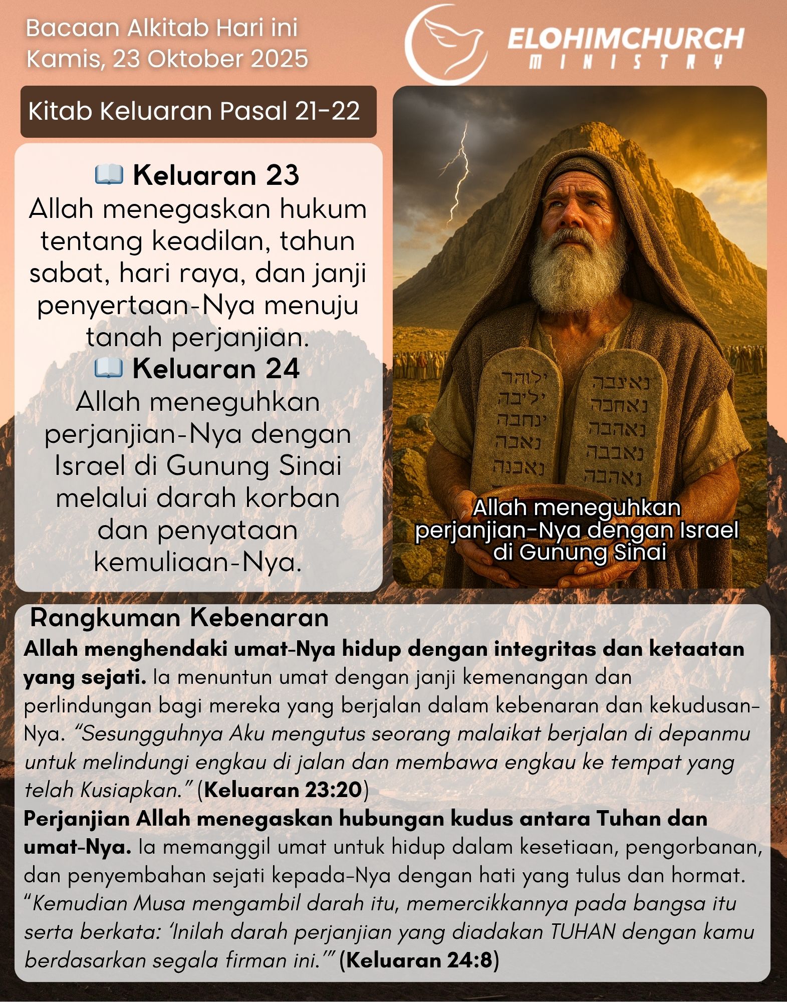 📖 Keluaran 23, Allah menegaskan hukum tentang keadilan, tahun sabat, hari raya, dan janji penyertaan-Nya menuju tanah perjanjian.