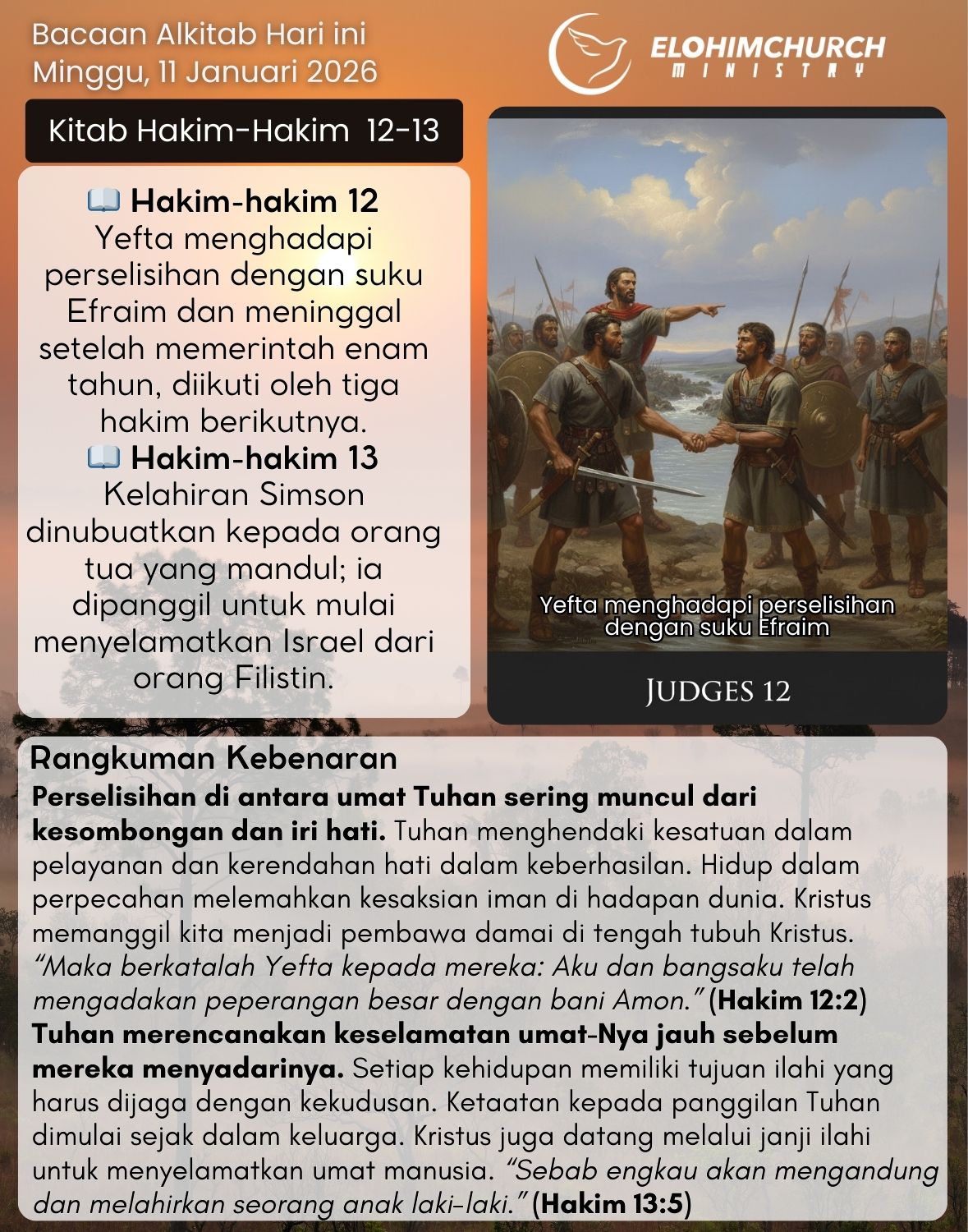 Perselisihan di antara umat Tuhan sering muncul dari kesombongan dan iri hati. Tuhan menghendaki kesatuan dalam pelayanan dan kerendahan hati dalam keberhasilan. Hidup dalam perpecahan melemahkan kesaksian iman di hadapan dunia. Kristus memanggil kita menjadi pembawa damai di tengah tubuh Kristus. “Maka berkatalah Yefta kepada mereka: Aku dan bangsaku telah mengadakan peperangan besar dengan bani Amon.” (Hakim-hakim 12:2)