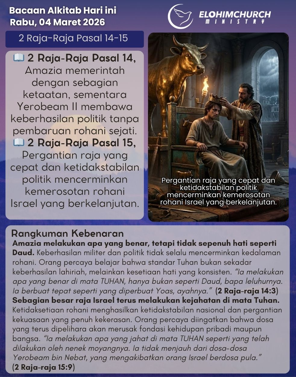 Sebagian besar raja Israel terus melakukan kejahatan di mata Tuhan. Ketidaksetiaan rohani menghasilkan ketidakstabilan nasional dan pergantian kekuasaan yang penuh kekerasan. Orang percaya diingatkan bahwa dosa yang terus dipelihara akan merusak fondasi kehidupan pribadi maupun bangsa. βIa melakukan apa yang jahat di mata TUHAN seperti yang telah dilakukan oleh nenek moyangnya. Ia tidak menjauh dari dosa-dosa Yerobeam bin Nebat, yang mengakibatkan orang Israel berdosa pula.β (2 Raja-raja 15:9)