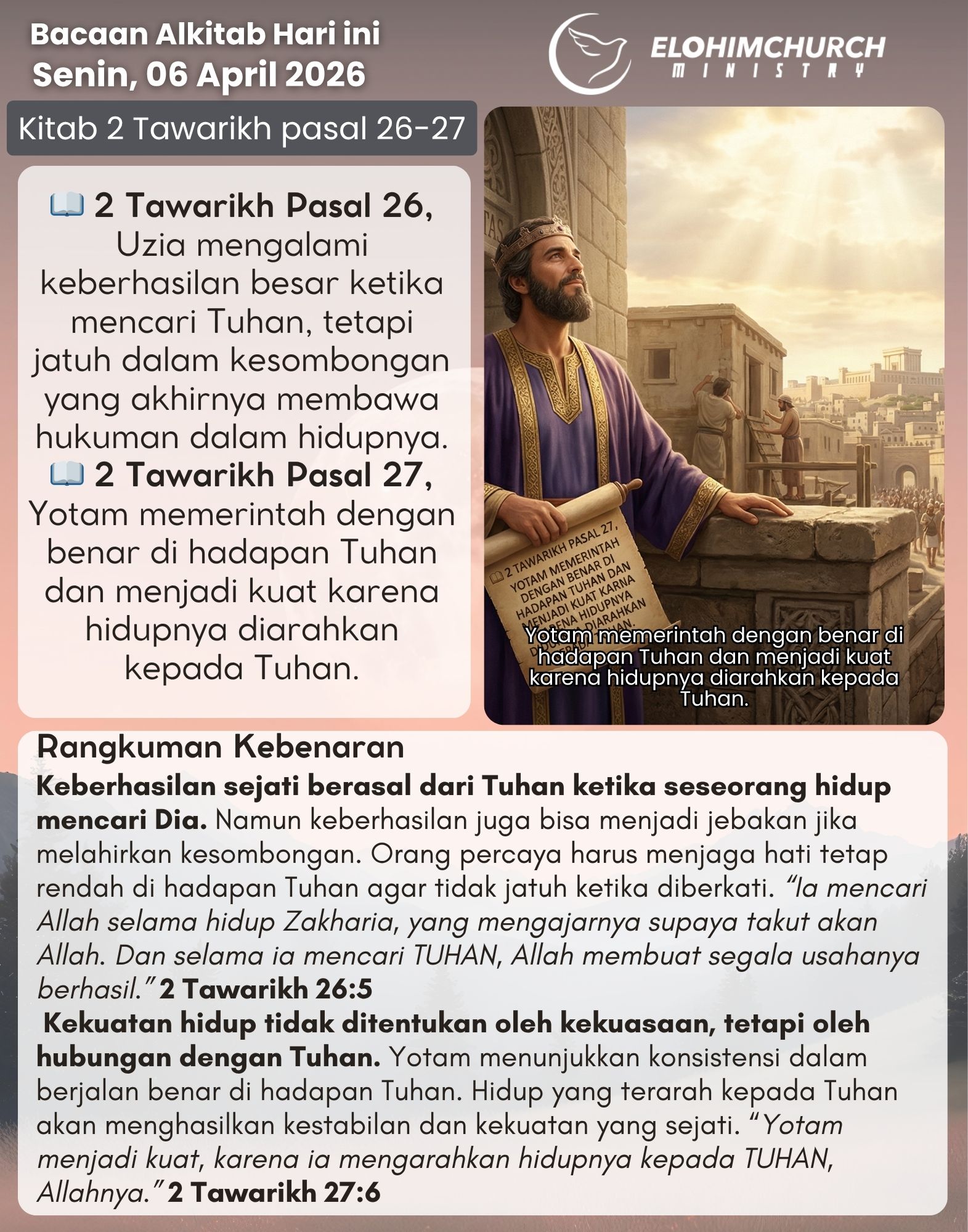 Elohim Ministry Bacaan Alkitab Bacaan Alkitab Sabtu, 11 April 2026  ~ Kitab  2 Tawarikh pasal 36 – Ezra pasal 1