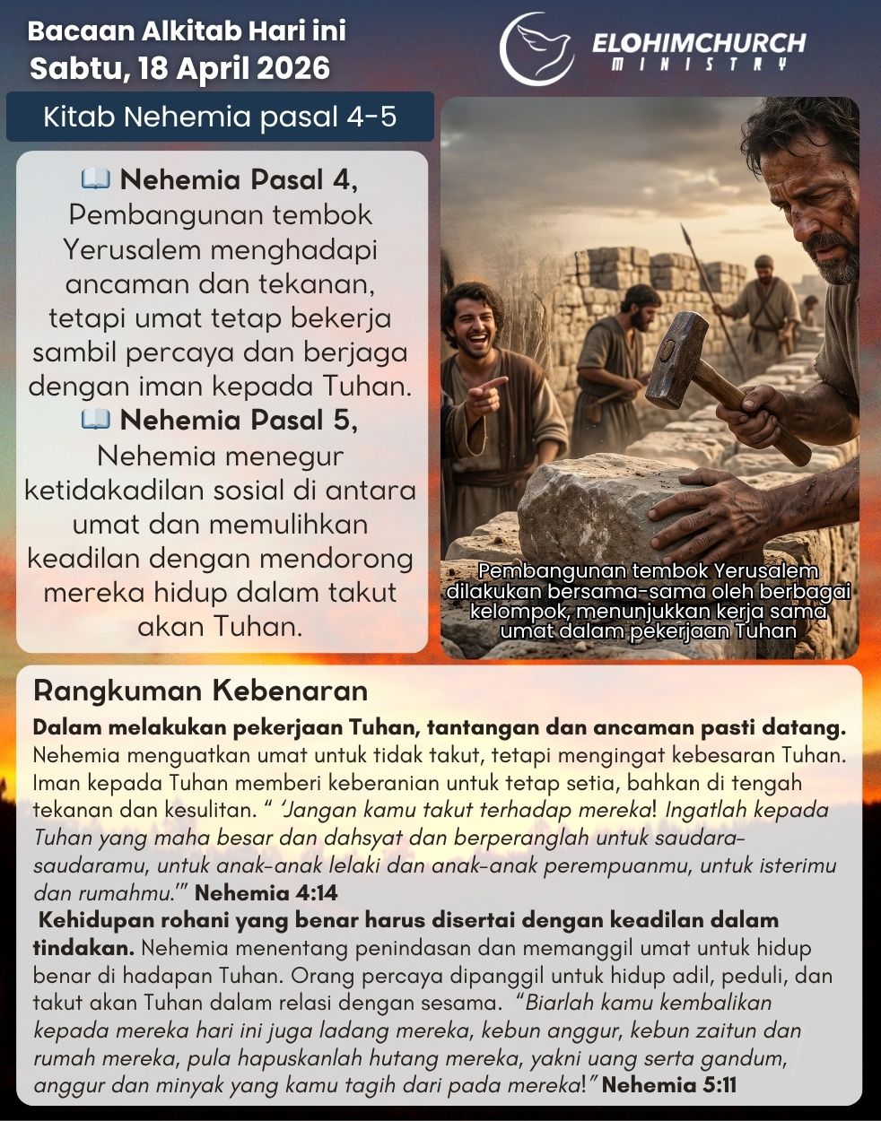 Dalam melakukan pekerjaan Tuhan, tantangan dan ancaman pasti datang. Nehemia menguatkan umat untuk tidak takut, tetapi mengingat kebesaran Tuhan. Iman kepada Tuhan memberi keberanian untuk tetap setia, bahkan di tengah tekanan dan kesulitan. “Kuamati semuanya, lalu bangun berdiri dan berkata kepada para pemuka dan para penguasa dan kepada orang-orang yang lain: ‘Jangan kamu takut terhadap mereka! Ingatlah kepada Tuhan yang maha besar dan dahsyat dan berperanglah untuk saudara-saudaramu, untuk anak-anak lelaki dan anak-anak perempuanmu, untuk isterimu dan rumahmu.’” Nehemia 4:14