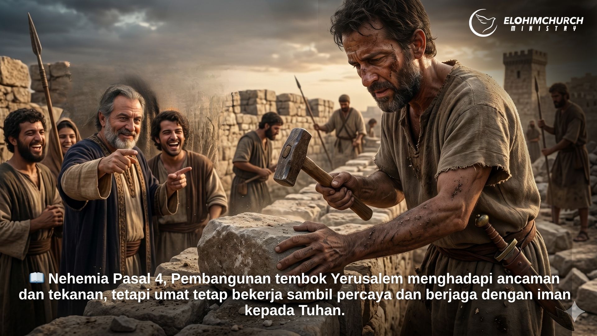 📖 Nehemia Pasal 4, Pembangunan tembok Yerusalem menghadapi ancaman dan tekanan, tetapi umat tetap bekerja sambil percaya dan berjaga dengan iman kepada Tuhan.