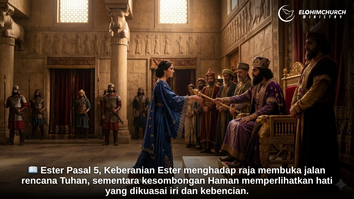 📖 Ester Pasal 5, Keberanian Ester menghadap raja membuka jalan rencana Tuhan, sementara kesombongan Haman memperlihatkan hati yang dikuasai iri dan kebencian.