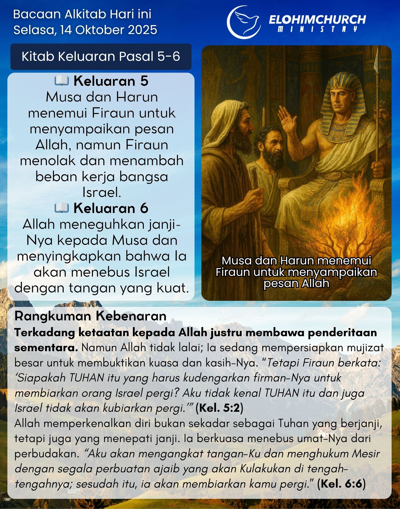 Bacaan Alkitab Selasa, 14 Oktober 2025 ~ Kitab Keluaran Pasal 5-6