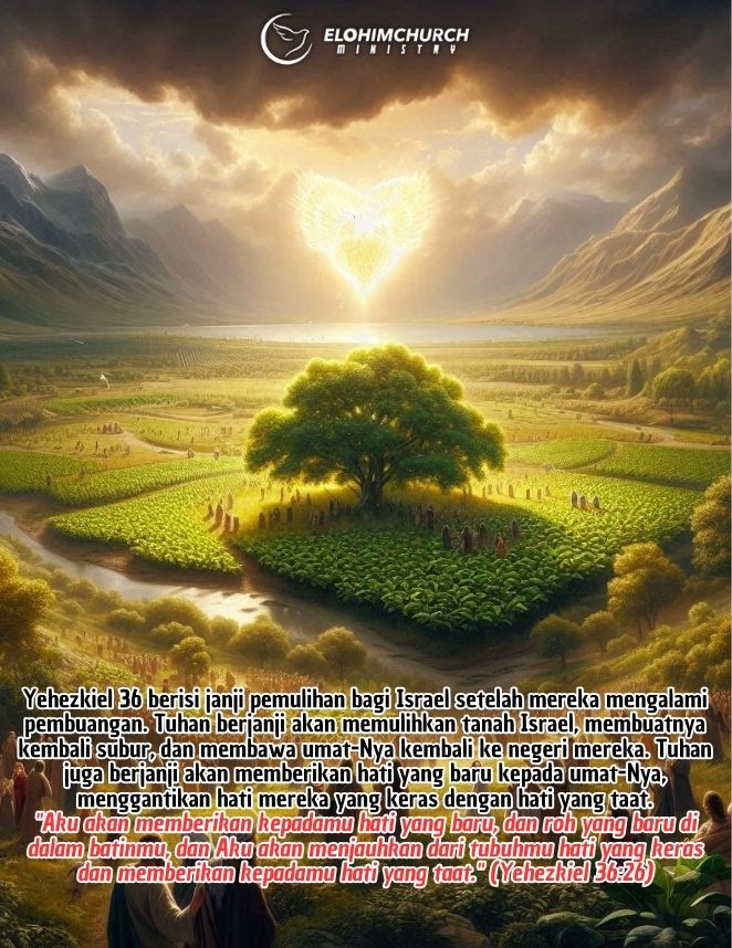 Yehezkiel 36 berisi janji pemulihan bagi Israel setelah mereka mengalami pembuangan. Allah berjanji untuk memulihkan kembali nama-Nya yang sudah dinajiskan oleh umat-Nya. Tuhan berjanji akan memulihkan tanah Israel, membuatnya kembali subur, dan membawa umat-Nya kembali ke negeri mereka. Tuhan juga berjanji akan memberikan hati yang baru kepada umat-Nya, menggantikan hati mereka yang keras dengan hati yang taat. Pemulihan ini bukan karena kebaikan Israel, tetapi karena kemuliaan nama Tuhan.