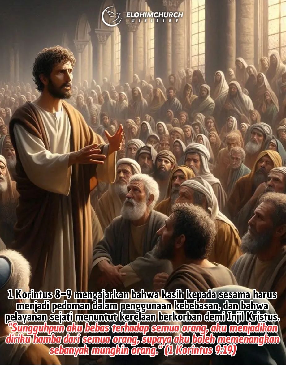 1 Korintus 8–9 mengajarkan bahwa kasih kepada sesama harus menjadi pedoman dalam penggunaan kebebasan, dan bahwa pelayanan sejati menuntut kerelaan berkorban demi Injil Kristus.