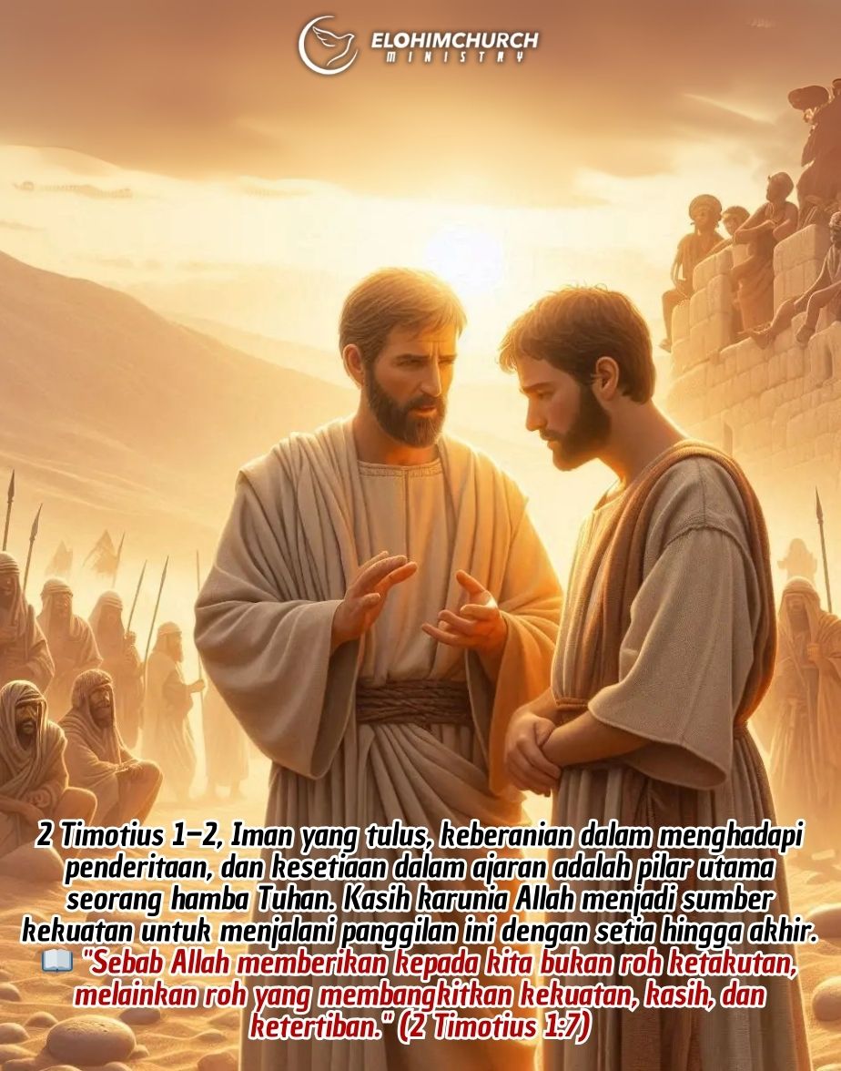 2 Timotius 1–2, Iman yang tulus, keberanian dalam menghadapi penderitaan, dan kesetiaan dalam ajaran adalah pilar utama seorang hamba Tuhan. Kasih karunia Allah menjadi sumber kekuatan untuk menjalani panggilan ini dengan setia hingga akhir.