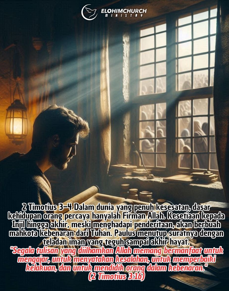 2 Timotius 3–4 Dalam dunia yang penuh kesesatan, dasar kehidupan orang percaya hanyalah Firman Allah. Kesetiaan kepada Injil hingga akhir, meski menghadapi penderitaan, akan berbuah mahkota kebenaran dari Tuhan. Paulus menutup suratnya dengan teladan iman yang teguh sampai akhir hayat.