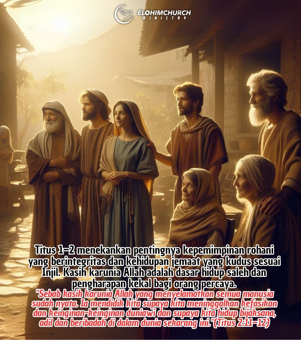 Titus 1–2 menekankan pentingnya kepemimpinan rohani yang berintegritas dan kehidupan jemaat yang kudus sesuai Injil. Kasih karunia Allah adalah dasar hidup saleh dan pengharapan kekal bagi orang percaya.