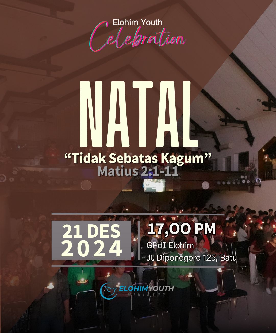 Mengundang rekan-rekan semuanya untuk bisa hadir dalam Youth ang akan diadakan pada hari SABTU, 21 Desember 2024 jam 17.00 di Gedung Gereja Elohim Batu