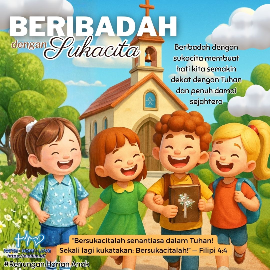 Adik-adik, Tuhan sangat senang kalau kita datang beribadah dengan hati yang bersukacita dan penuh semangat. Kenapa? Karena ibadah bukan sekadar rutinitas — ibadah adalah saat kita bisa berjumpa dengan Tuhan, memuji-Nya, berdoa, dan mendengarkan firman-Nya. Tuhanlah yang menciptakan kita, yang mengasihi kita, dan yang menebus dosa kita melalui Tuhan Yesus. Itu sebabnya, beribadah harus dilakukan dengan rasa syukur dan kasih kepada Tuhan.