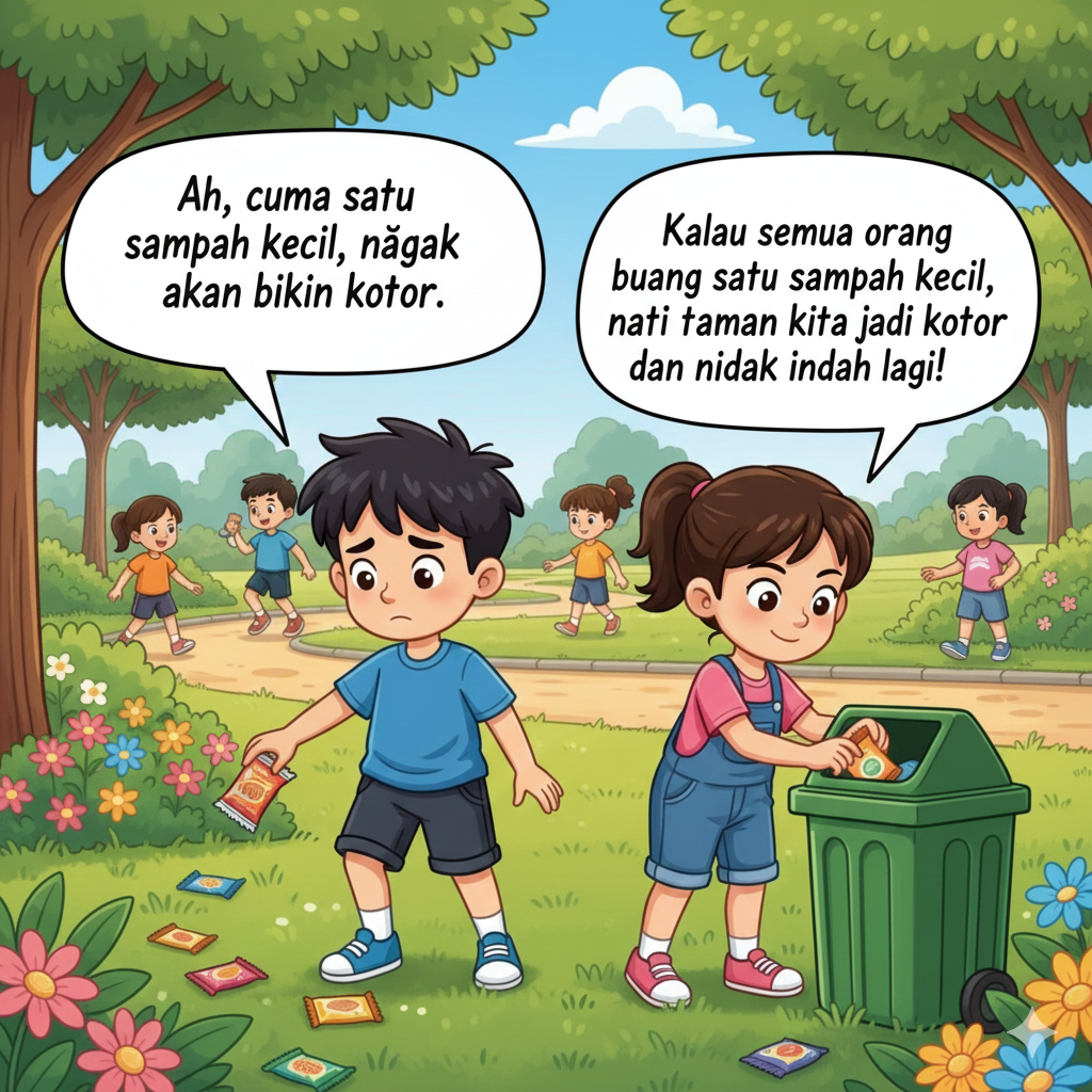 Suatu hari, ada dua anak bernama Rafi dan Dinda. Mereka berdua bermain di taman dekat rumah. Rafi suka membuang bungkus jajannya sembarangan, tapi Dinda selalu memungutnya dan memasukkannya ke tempat sampah. Rafi berkata, “Ah, cuma satu sampah kecil, nggak akan bikin kotor.” Tapi Dinda menjawab, “Kalau semua orang buang satu sampah kecil, nanti taman kita jadi kotor dan tidak indah lagi!”