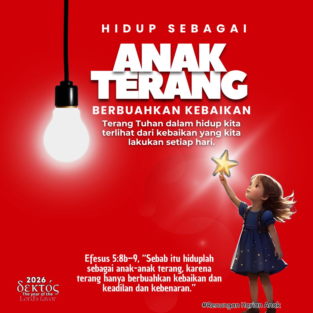 Firman Tuhan dalam Efesus 5:8-9 berkata bahwa dahulu kita hidup dalam kegelapan, tetapi sekarang kita adalah terang di dalam Tuhan. Itu berarti hidup kita harus berbeda. Jika dulu mungkin kita suka membalas kejahatan, marah, atau mengejek, sekarang kita dipanggil untuk hidup dalam kebaikan, keadilan, dan kebenaran. Menjadi anak terang artinya hidup kita memancarkan kebaikan seperti cahaya lampu di tempat gelap. Ketika ada terang, orang bisa melihat dengan jelas. Begitu juga ketika kita melakukan kebaikan, orang lain bisa melihat kasih Tuhan melalui hidup kita.