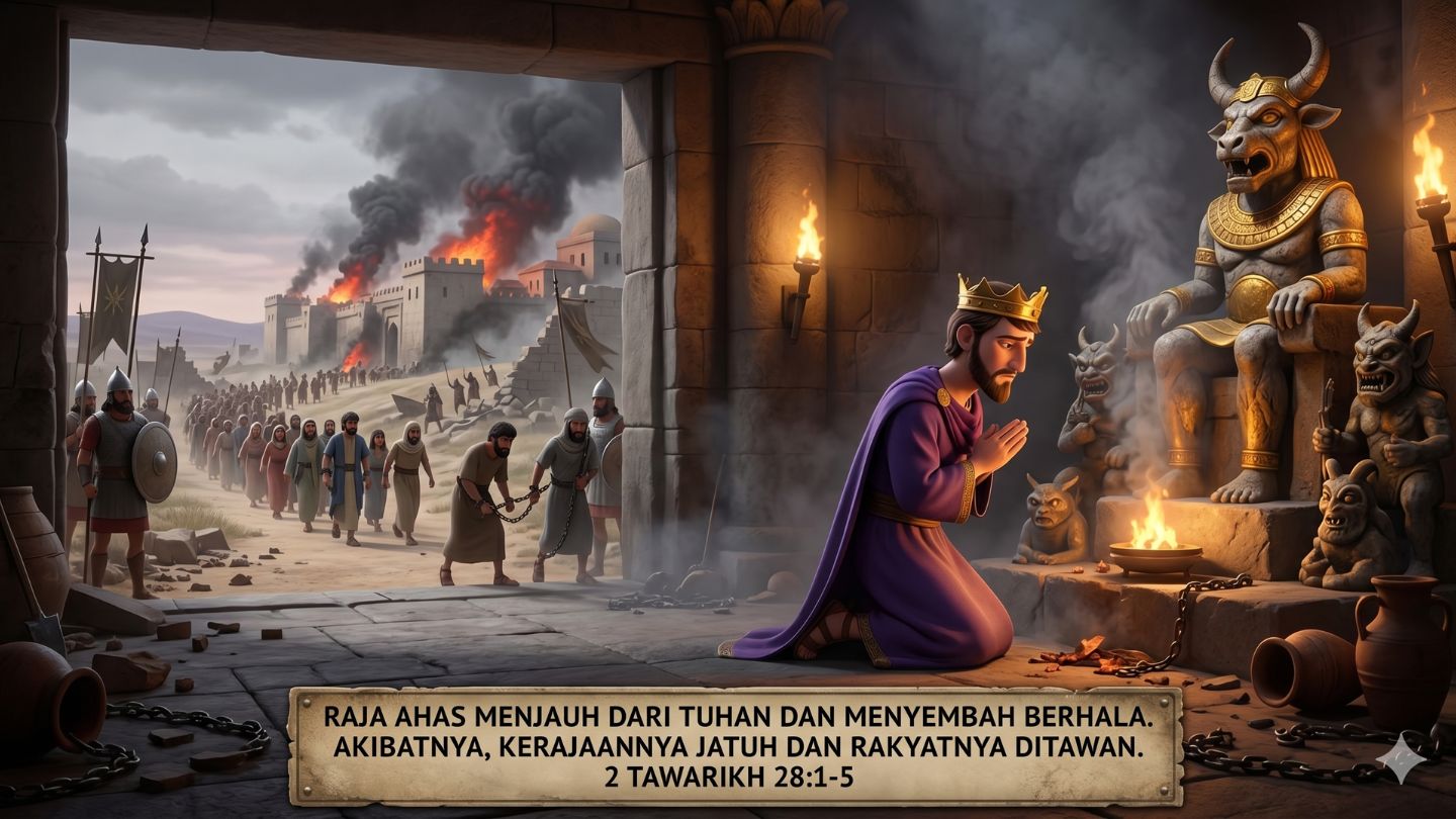 Akibat dari pilihannya itu sangat serius. Karena Ahas menjauh dari Tuhan, Tuhan tidak lagi menyertainya seperti sebelumnya. Dalam peperangan, ia mengalami kekalahan, dan banyak rakyatnya ditawan oleh musuh. Negerinya menjadi lemah, dan rakyatnya hidup dalam kesusahan. Semua ini terjadi karena ia tidak lagi mengandalkan Tuhan. Dari kisah ini kita belajar bahwa ketika seseorang menjauh dari Tuhan dan memilih jalan yang salah, hidupnya bisa dipenuhi masalah dan kesulitan. Bukan karena Tuhan tidak mengasihi, tetapi karena ia sendiri memilih berjalan tanpa Tuhan. Oleh sebab itu, penting sekali bagi kita untuk tetap dekat dengan Tuhan setiap hari.