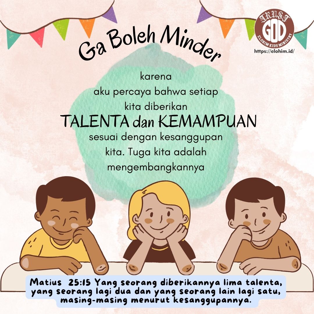 Jadi adik-adik apa pun keadaan kita jangan pernah merasa minder atau tidak percaya diri. Tuhan memberikan talenta kepada kita sesuai dengan kemampuan kita dan pasti pas.