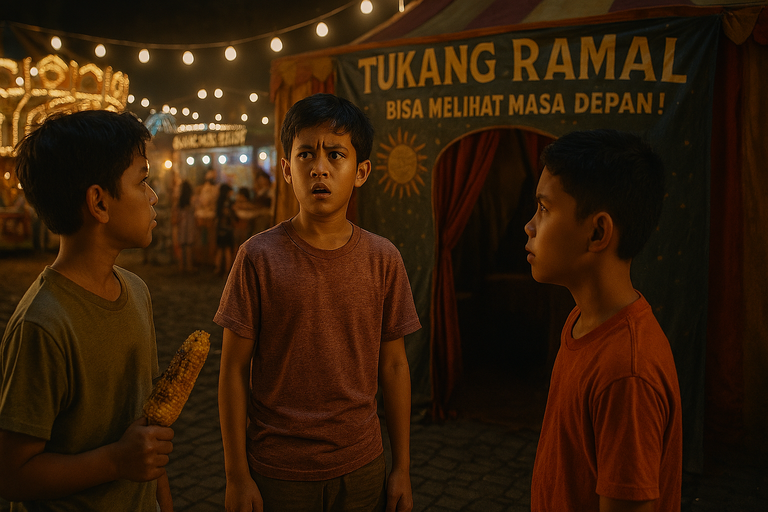 Suatu sore, Agus dan teman-temannya pergi ke pasar malam di alun-alun kota. Mereka sangat senang bermain komidi putar, memancing ikan, dan makan jagung bakar. Tapi, setelah itu, Agus melihat sebuah tenda besar bertuliskan “Tukang Ramal – Bisa Melihat Masa Depan!”. Agus penasaran dan berkata, “Ayo, kita masuk! Katanya dia bisa tahu siapa yang akan jadi orang sukses nanti.” Teman-temannya langsung menolak. “Ah, itu tidak benar, Gus,” kata Rio. “Hanya Tuhan yang tahu masa depan kita. Tukang ramal itu bohong. Kita tidak boleh percaya hal begitu. Itu dosa.”