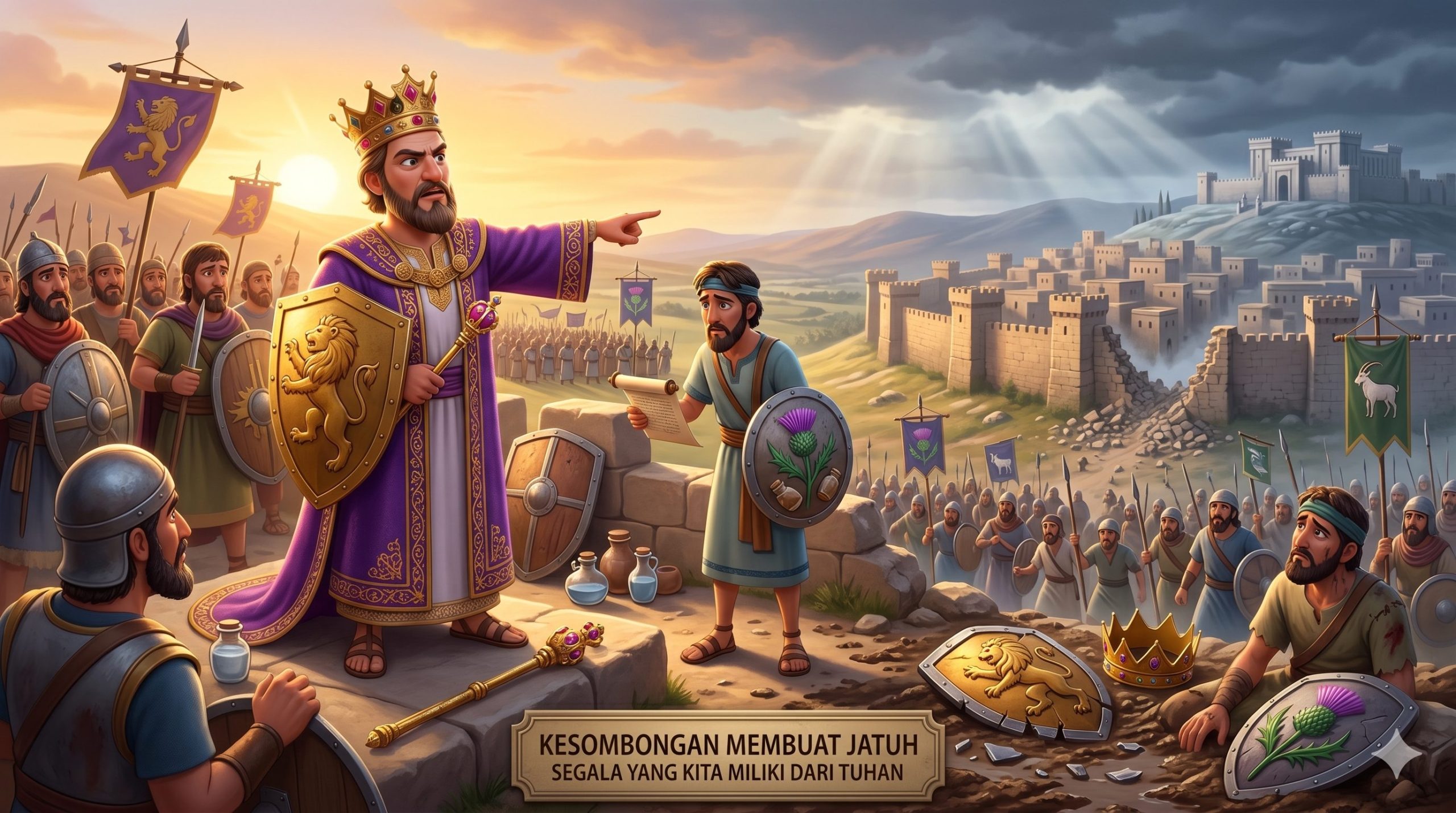 Adik-adik, kita melanjutkan cerita dari seorang raja bernama Amazia (2 Tawarikh 25:17-25). Awalnya ia mengalami kemenangan karena pertolongan Tuhan. Tetapi setelah menang, hatinya berubah menjadi sombong. Amazia merasa dirinya sangat kuat. Ia bahkan menantang raja lain, yaitu Yoas, untuk berperang. Padahal Yoas sudah mengingatkan supaya Amazia tidak sombong. Sayangnya, Amazia tidak mau mendengarkan. Ia tetap maju berperang. Apa yang terjadi? Amazia kalah dalam peperangan, Ia dipermalukan dan Hidupnya menjadi sulit dan banyak tantangan