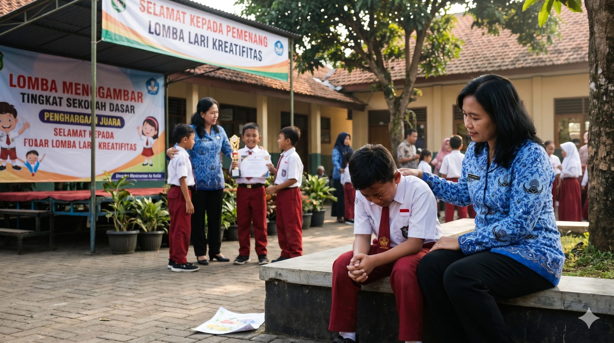 Ada seorang anak bernama Reno. Ia baru saja memenangkan lomba menggambar di sekolah. Semua guru dan teman-temannya memuji hasil gambarnya. Awalnya Reno bersyukur, tetapi lama-lama ia mulai berubah. Ia berkata kepada temannya, “Gambarmu jelek, tidak seperti punyaku!”