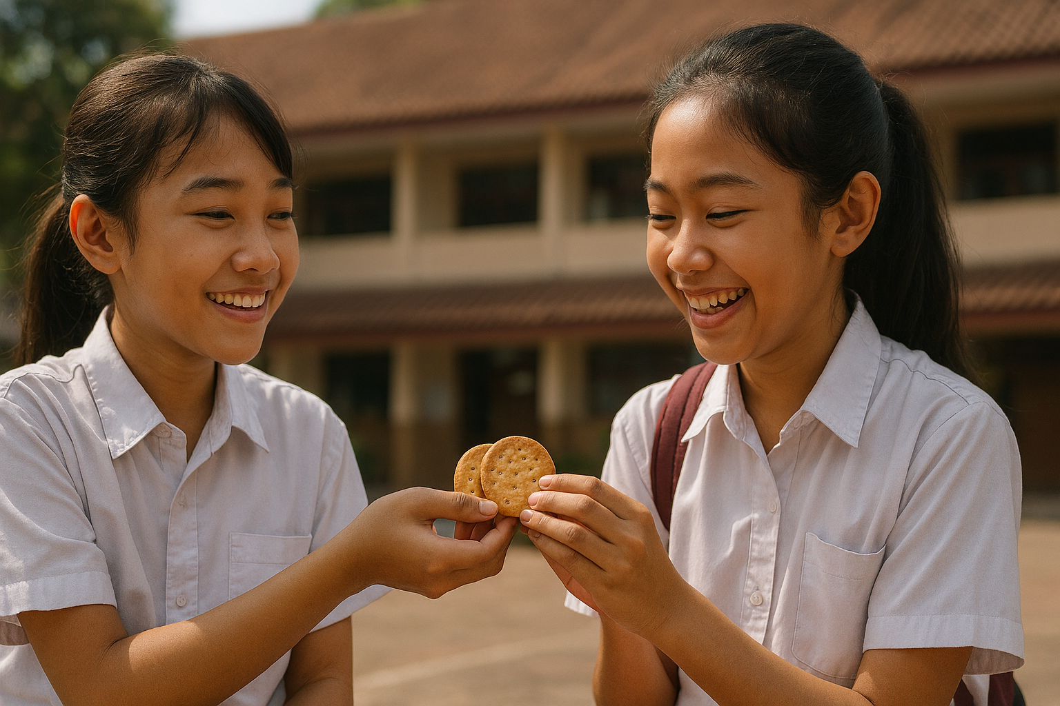 Suatu pagi, Rina membawa dua biskuit ke sekolah. Saat waktu istirahat tiba, ia melihat temannya, Sinta, duduk diam dan tampak sedih. Ternyata, Sinta lupa membawa bekal. Tanpa berpikir lama, Rina tersenyum dan berkata,“Ini, Sinta. Aku punya dua biskuit. Kita makan bareng, ya!” 🍪 Sinta langsung tersenyum bahagia dan mengucapkan terima kasih. Rina juga merasa senang sekali — bukan karena ia mendapat pujian, tapi karena hatinya damai setelah membantu temannya. Ia memberi dengan sukacita, bukan karena disuruh atau terpaksa.
