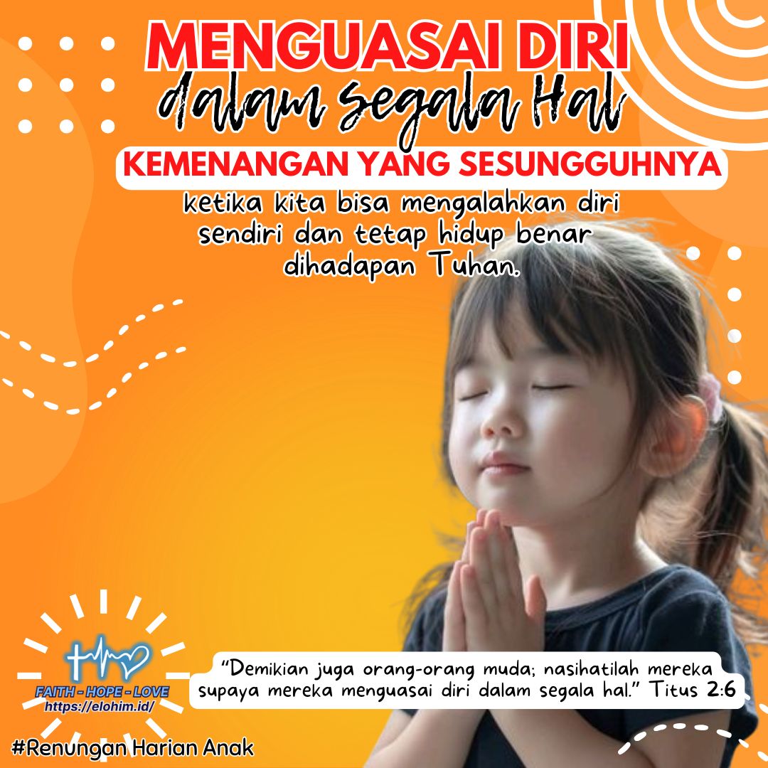 Adik-adik, menguasai diri bukan hal yang mudah, tapi sangat penting. Dengan penguasaan diri, kita bisa menahan amarah, mengendalikan ucapan, menjaga pikiran, dan hidup sesuai dengan firman Tuhan. Ingatlah, kemenangan terbesar bukan hanya saat kita berhasil di sekolah, di pertandingan, atau dalam perlombaan, tetapi ketika kita bisa mengalahkan diri sendiri dan tetap hidup benar di hadapan Tuhan.