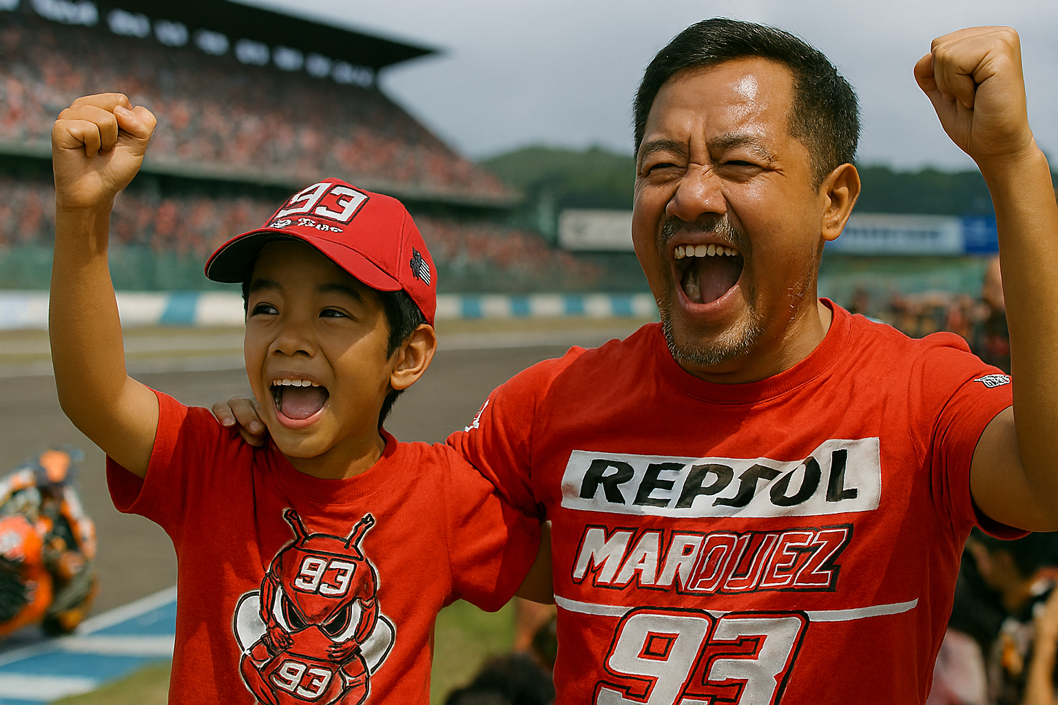 Dan mereka juga bersorak bergembira karena pembalap andalan mereka Marquez memastikan gelar juaranya usai finis posisi kedua pada balapan MotoGP Jepang 2025 di Sirkuit Twin Ring Motegi, Minggu (28/9) siang WIB.