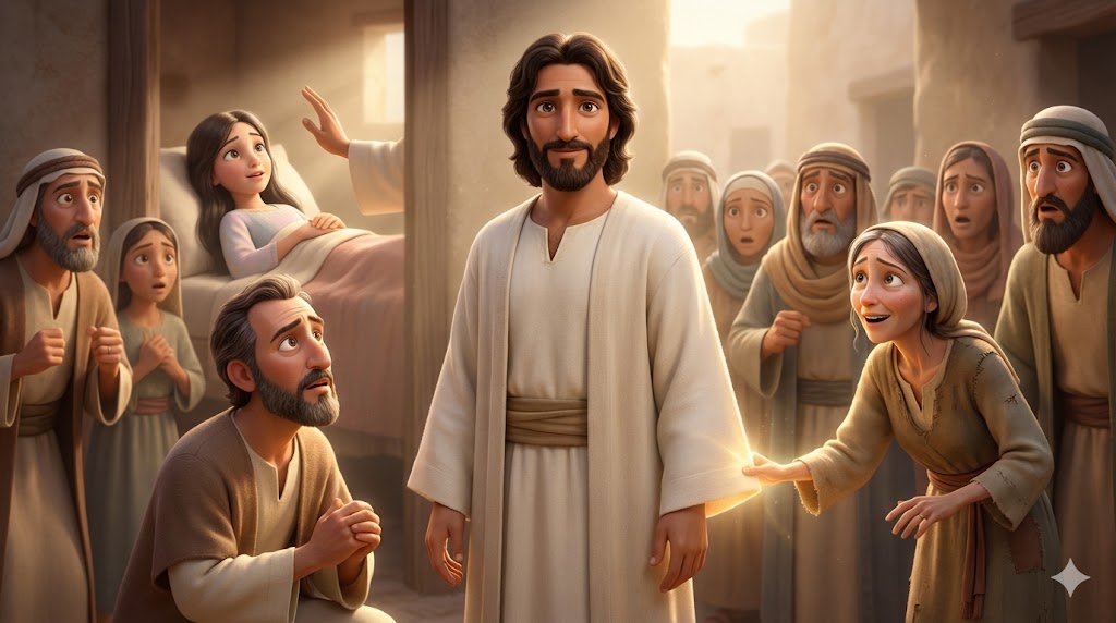 Dalam Markus 5:21–43, kita membaca tentang dua mukjizat besar. Pertama, seorang kepala rumah ibadat bernama Yairus datang kepada Yesus karena anaknya sakit keras. Ia sangat percaya bahwa Yesus sanggup menolong. Ketika orang-orang berkata bahwa anaknya sudah meninggal, Yesus berkata, “Jangan takut, percaya saja!” Dan benar, Yesus membangkitkan anak itu. Di perjalanan menuju rumah Yairus, ada seorang perempuan yang sudah sakit pendarahan selama 12 tahun. Ia percaya bahwa jika ia menjamah ujung jubah Yesus saja, ia akan sembuh. Karena imannya, mukjizat terjadi dan ia disembuhkan.