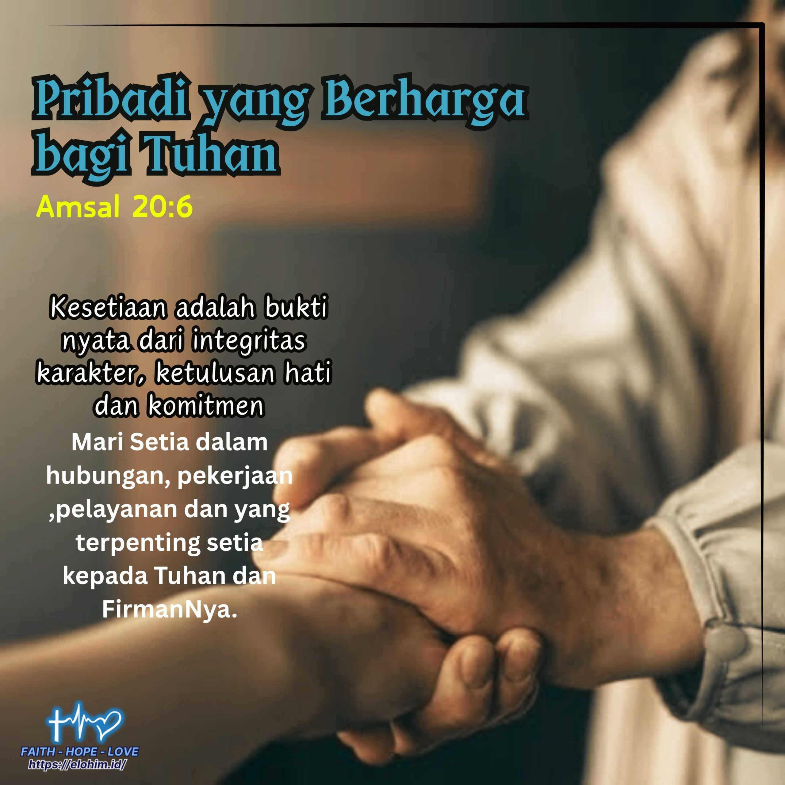 Didalam Amsal 20 : 6 ayat ini mungkin terlihat sederhana, namun mengandung makna yang sangat dalam tentang apa sebenarnya yang membuat seseorang berharga dimata Tuhan dan sesama. Di dunia ini banyak orang ingin terlihat baik, ingin diakui sebagai orang baik, bahkan mungkin secara lantang menyatakan kebaikan hatinya, namun pertanyaannya adalah siapa yang dapat menemukan orang yang benar-benar setia ? Mari kita selami lebih dalam makna dari ayat ini kaitannya dengan pribadi yang berharga.