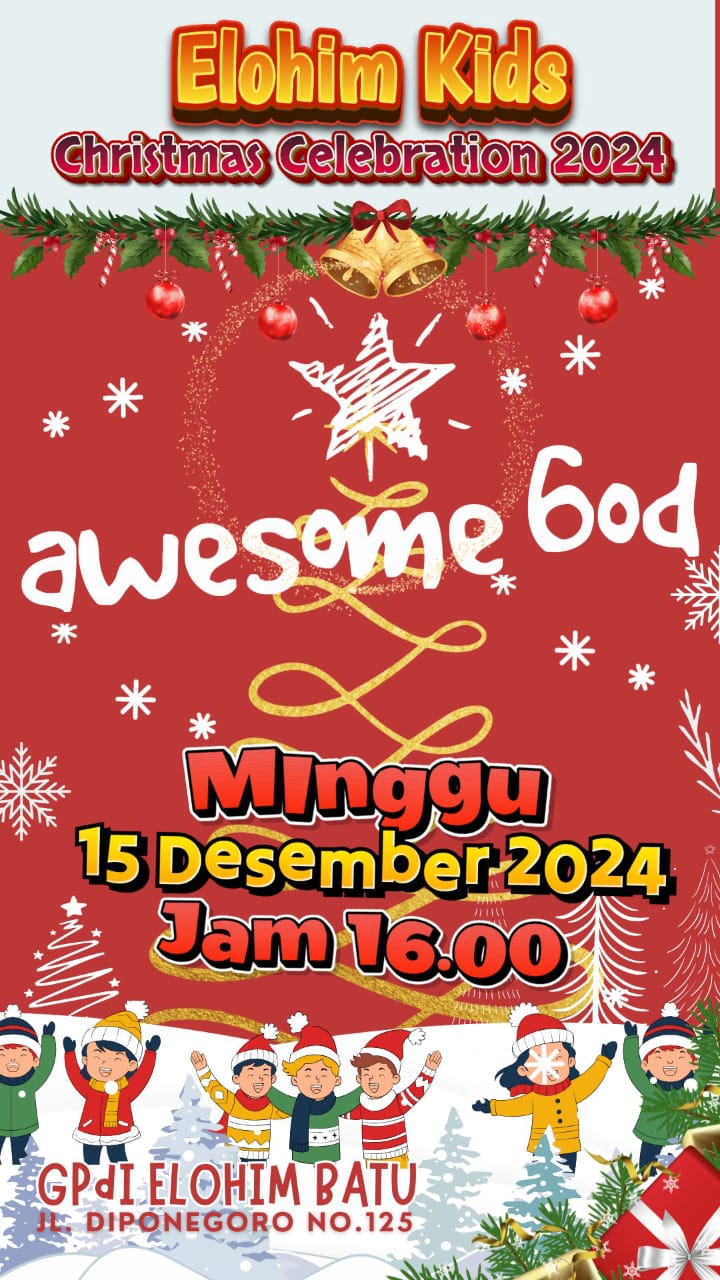 Jangan lupa adik-adik semuanya, untuk mengikuti ibadah Natal Anak Elohim … ayo semuanya hadir ya dalam acara besok jam 16.00 di Gedung Gereja GPdI Elohim Batu.