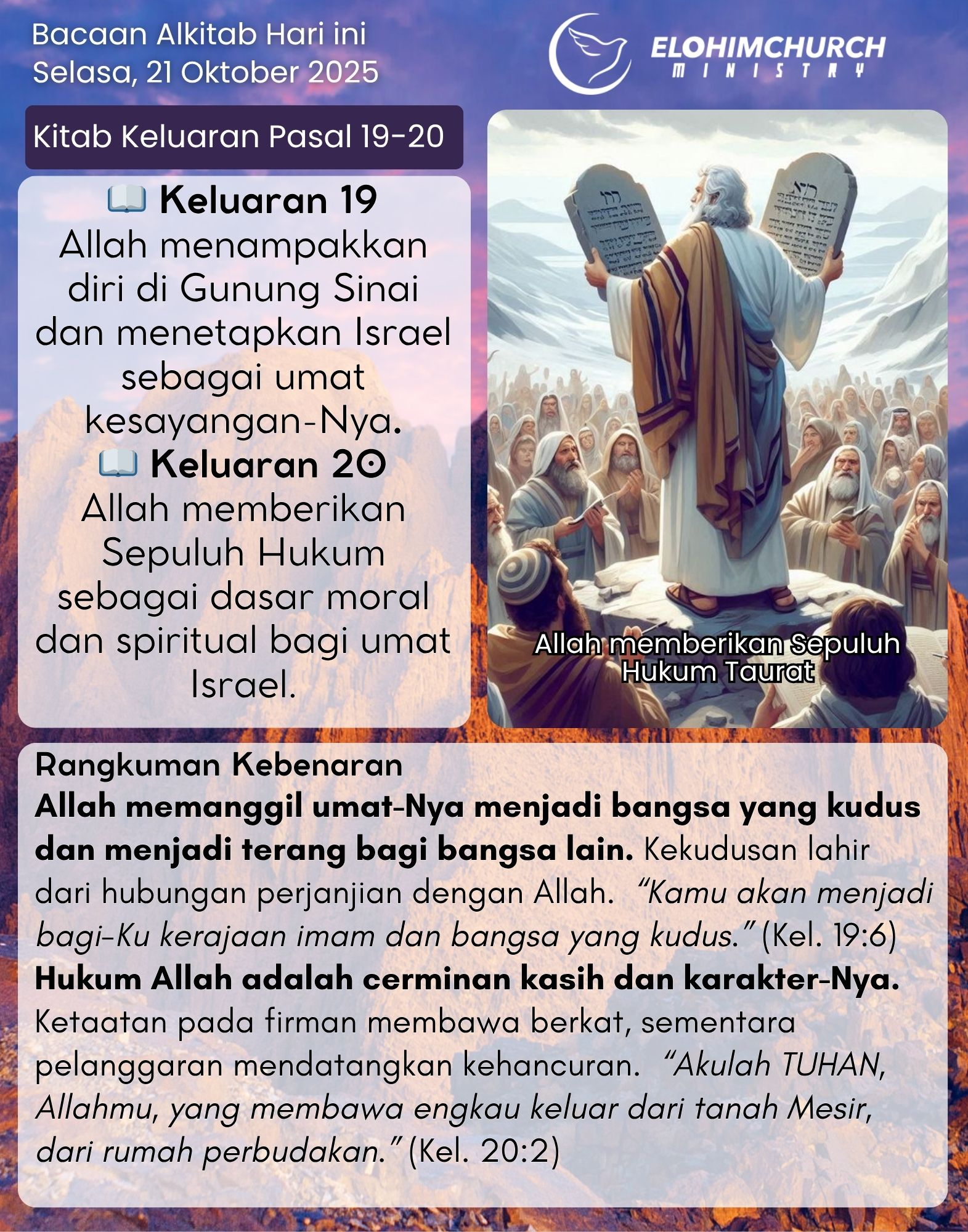 📖 Keluaran 19, Allah menampakkan diri di Gunung Sinai dan menetapkan Israel sebagai umat kesayangan-Nya. 📖 Keluaran 20, Allah memberikan ...