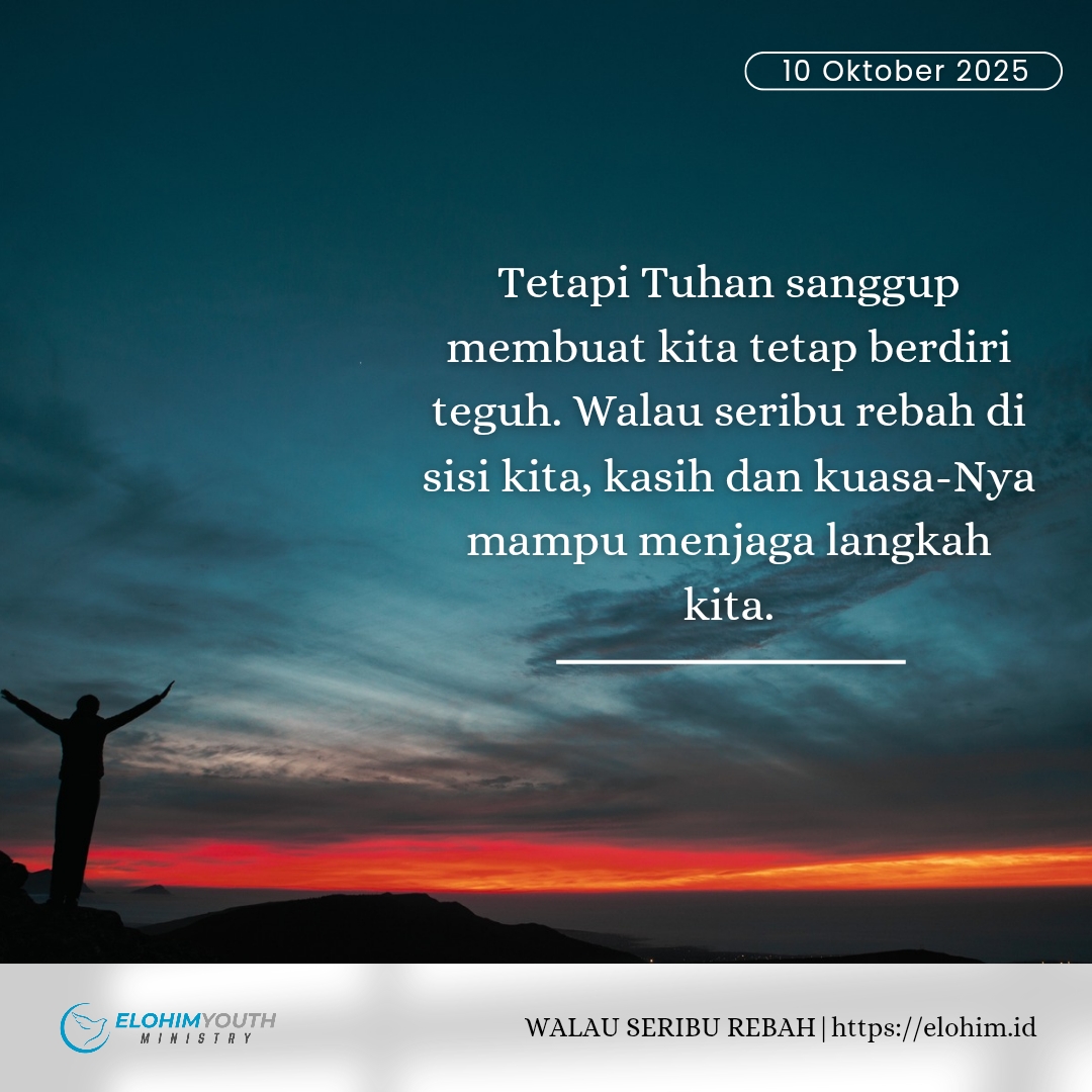 Renungan Harian Youth, Jumat 10 Oktober 2025 “Walau seribu orang rebah di sisimu, dan sepuluh ribu di sebelah kananmu, tetapi itu tidak akan menimpamu.” — Mazmur 91:7 Rekan-rekan kita hidup di masa yang serba cepat, penuh perubahan, dan terkadang penuh ketakutan. Dunia seolah tak lagi bisa diprediksi. Ada isu perang, pandemi, inflasi, perubahan iklim, hingga …