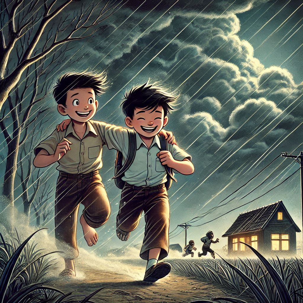 “Ayo, cepat pulang, nanti keburu hujan!” ajak Joni sambil menarik lengan Agus. Siang itu langit tampak sangat gelap, dan angin bertiup cukup kencang, membuat suasana terasa mendung dan dingin. Joni dan Agus baru saja selesai sekolah dan berjalan cepat-cepat menuju rumah masing-masing. “Wah, kalau hujan turun, pasti deras banget!” kata Agus sambil mempercepat langkahnya. “Iya, lihat saja itu awan, gelap sekali!” sahut Joni sambil menunjuk ke arah langit.