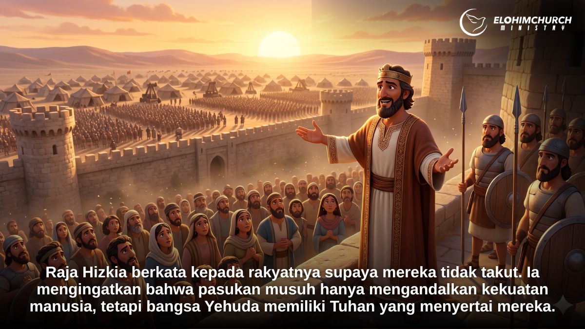 Raja Hizkia berkata kepada rakyatnya supaya mereka tidak takut. Ia mengingatkan bahwa pasukan musuh hanya mengandalkan kekuatan manusia, tetapi bangsa Yehuda memiliki Tuhan yang menyertai mereka.