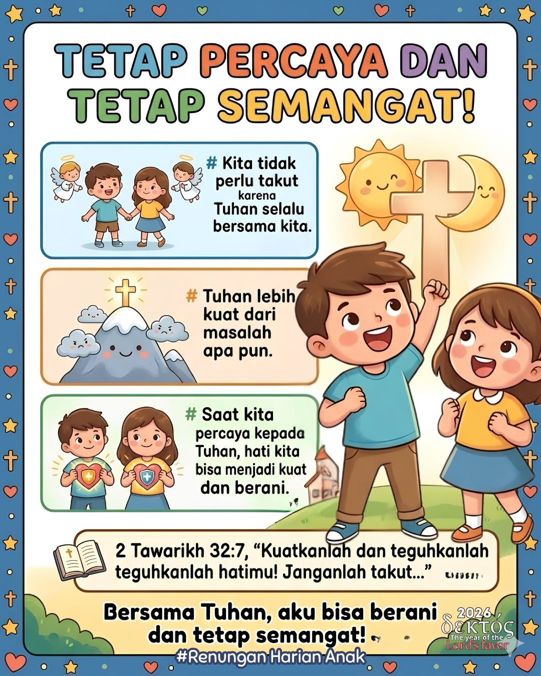 Dari renungan hari ini kita belajar Saat adik-adik merasa takut atau menghadapi sesuatu yang sulit, cobalah untuk berdoa kepada Tuhan. Ceritakan semua perasaanmu kepada-Nya. Lalu, tetaplah berusaha melakukan yang terbaik, seperti belajar dengan rajin saat ujian atau berlatih dengan sungguh-sungguh. Ingat, Tuhan tidak pernah meninggalkan kita, jadi kamu bisa tetap percaya dan semangat setiap hari.