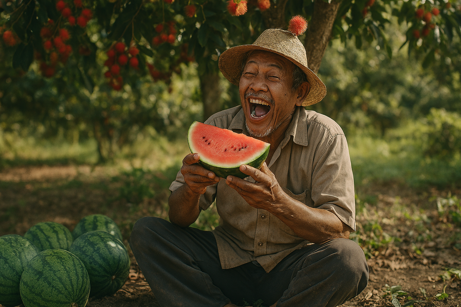 Ada seorang petani bernama Pak Untung. Suatu siang, ia sedang beristirahat di ladangnya setelah memanen buah semangka. Karena cuacanya panas sekali, ia duduk di bawah pohon rambutan sambil menikmati potongan semangka segar. Saat melihat pohon rambutan di belakangnya, tiba-tiba ia berpikir, “Hmm… kenapa ya Tuhan menaruh buah semangka yang besar ini di batang kecil di tanah? Kenapa tidak di pohon besar seperti pohon rambutan ini saja? Kalau buah besar tumbuh di pohon besar, kan lebih cocok!”